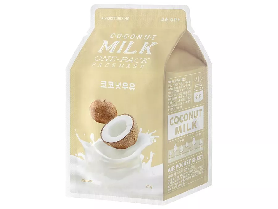 A'PIEU - Milk One Pack Mask - Coconut - hydratační maska na obličej. Kokosový extrakt vyživuje a chrání pokožku před nadměrnou ztrátou vody, mléčný extrakt hydratuje, zklidňuje podráždění a má anti-age vlastnosti a extrakt z mořských řas má antioxidační vlastnosti a působí proti stárnutí. Maska se dobře přizpůsobuje tvaru obličeje a je vhodná pro všechny typy pleti, zejména pro suchou.
