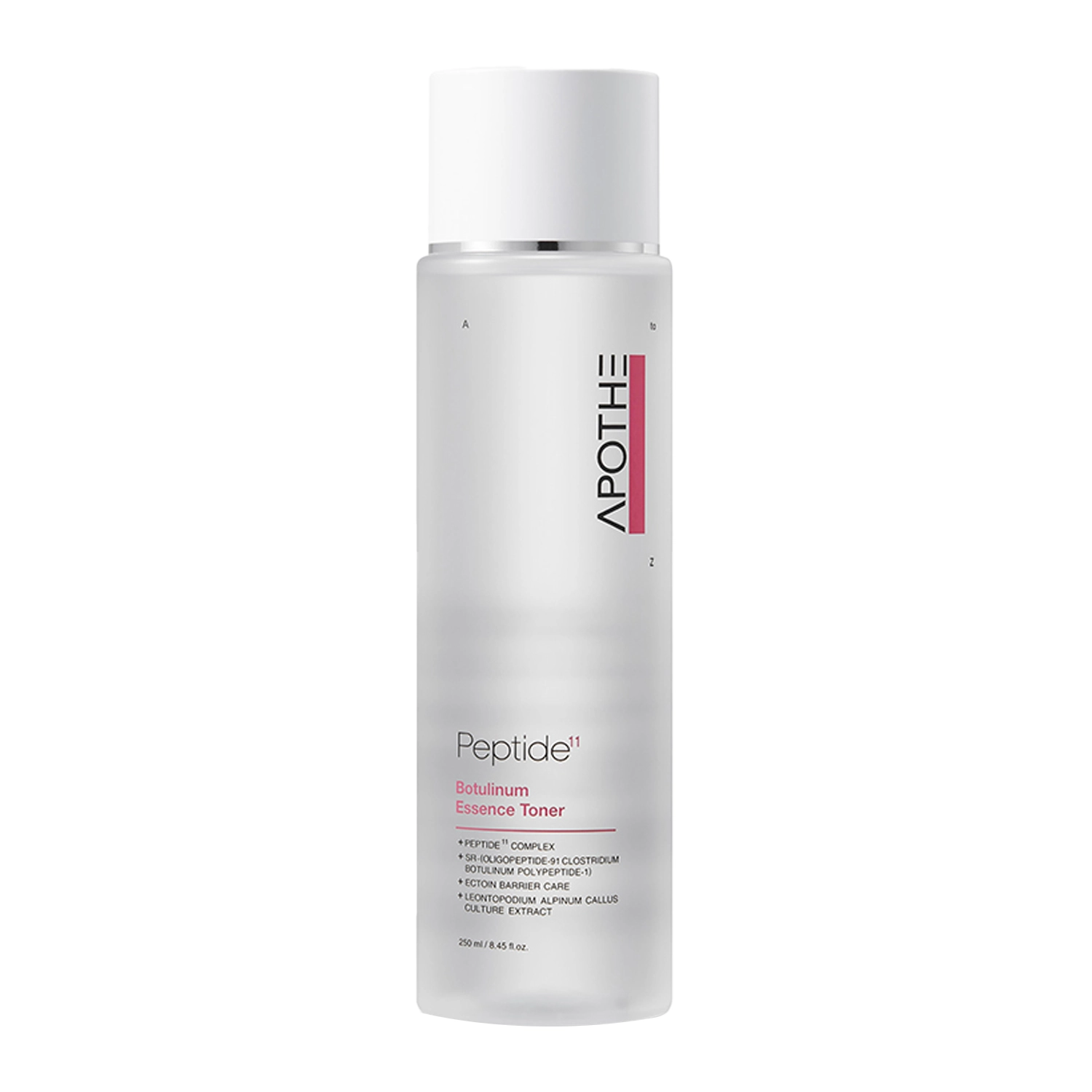 APOTHE - Peptide 11 Botulinum Essence Toner - tonikum pro obličej. Díky svému složení intenzivně hydratuje a zvyšuje pružnost pleti. Složení tonikumu je založeno na komplexu až jedenácti peptidů (včetně složky inspirované působením botulotoxinu). Společně peptidy redukují viditelné vrásky a zlepšují elasticitu. Přídavek niacinamidu a hyaluronátu sodného posiluje kožní bariéru, vyrovnává tón pleti a poskytuje dlouhotrvající hydratace. panthenol , alantoin a trehalóza zase přinášejí okamžité zklidnění. Přípravek je skvělý pro pleť vyžadující regeneraci, vyhlazení a dávku hydratace.