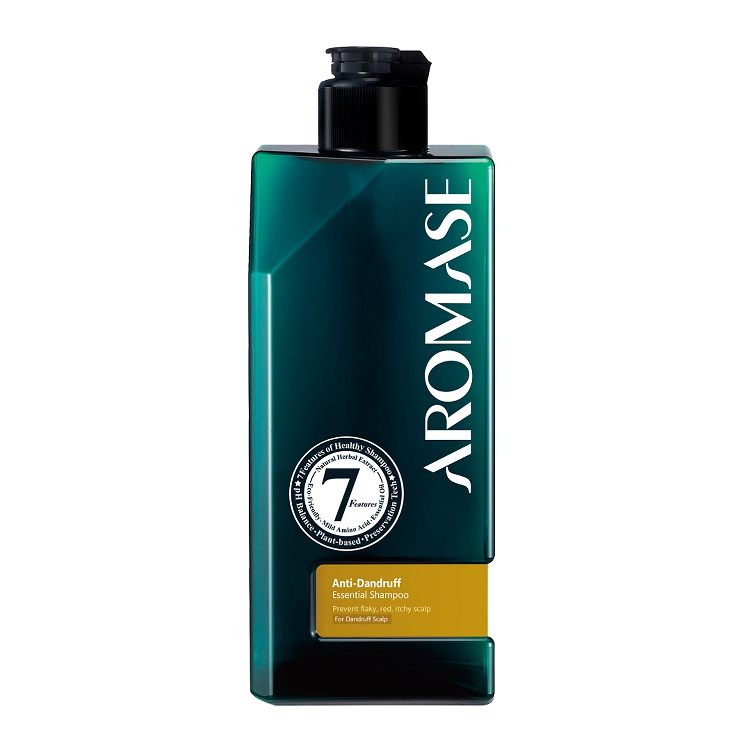 Aromase - Anti-Dandruff Essential Shampoo - šampon pro mastnou a svědivou pokožku hlavy se sklonem k lupům. Obsahuje kyselinu citronovou a extrakt ze zázvoru, které zklidňují svědění, jemně exfoliují pokožku hlavy, redukují lupy a dodávají vlasům lesk, kyselinu glycyrhetinovou, která vyrovnává kožní mikrobiom, čistí pokožku hlavy, uvolňuje ucpané póry a reguluje sekreci kožního mazu, niacinamid, který zlepšuje krevní oběh a posiluje vlasové folikuly, panthenol, který hydratuje a zanechává vlasy jemné a hladké a mentol, který má silné antiseptické účinky, příjemně chladí a osvěžuje a dodává přípravku energizující vůni máty.