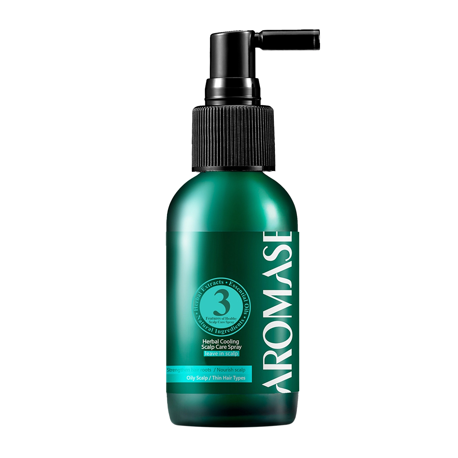Aromase - Herbal Cooling Scalp Care Spray - bylinný sprej pro péči o pokožku hlavy. Posiluje vlasové cibulky a zabraňuje nadměrnému vypadávání vlasů. Obsahuje mentol, který jemně chladí a osvěžuje, 4-Terpineol, který má protizánětlivé účinky a minimalizuje sklon k šupinatění pokožky, extrakt z plodů palmy (serenoa plazivá), který zabraňuje vypadávání vlasů a vyživuje a panthenol a šťávu z aloe vera, které zklidňují podráždění a urychlují regeneraci. Přípravek nevyžaduje oplachování.