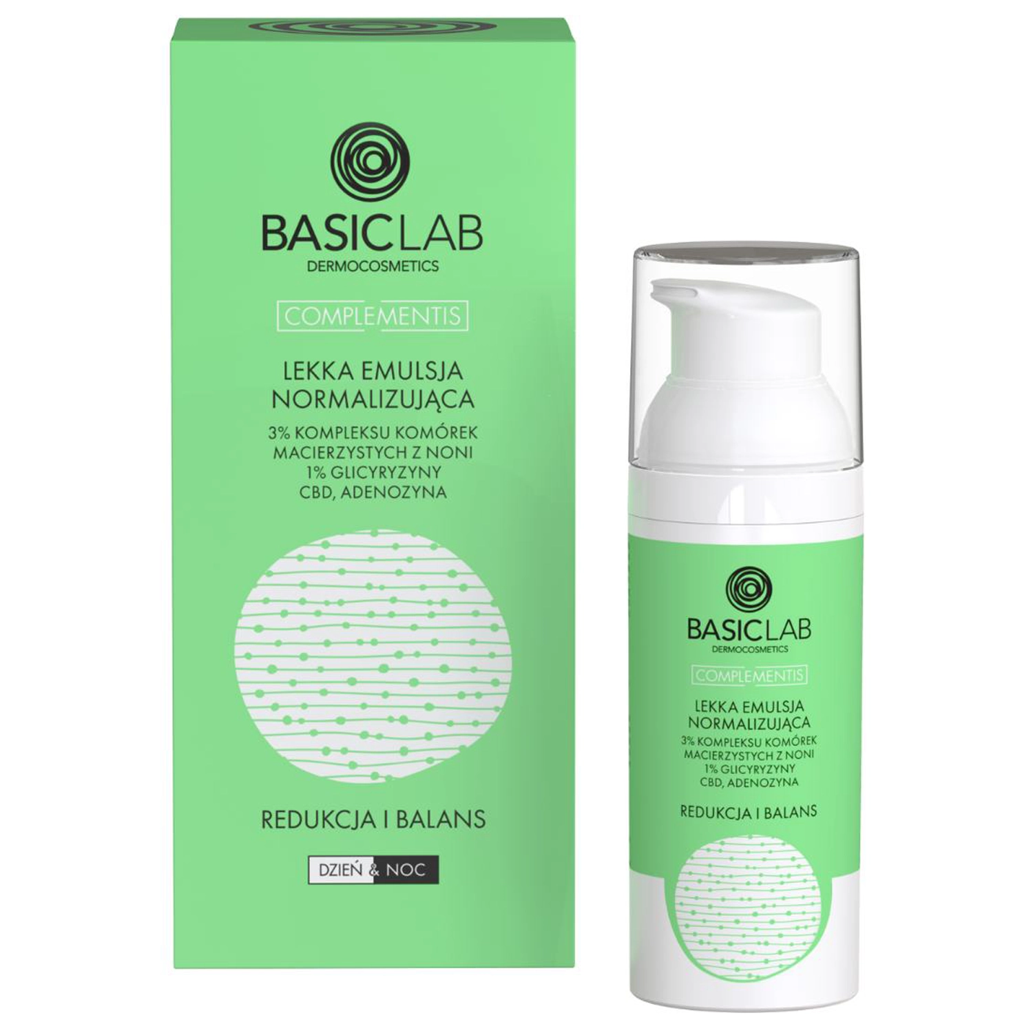 BasicLab - Redukce a rovnováha - Lehká emulze s 3% komplexem kmenových buněk, 1 % glycyrrhizinu, CBD a adenosinem - normalizující emulze pro ranní a večerní péči o smíšenou, mastnou a aknózní pleť. Má lehkou konzistenci, rychle se vstřebává a zanechává saténový finish. Obsahuje 3% komplex rostlinných kmenových buněk z morindy barvířské (Noni), který spolu s CBD (Cannabidiol) a sarkosinem normalizují sekreci kožního mazu, redukují projevy akné a zabraňují jejich opětovnému vzniku, glycyrrhizin v koncentraci 1 %, který normalizuje a sjednocuje tón pleti a trehalózu, která hydratuje. Emulze snižuje viditelnost rozšířených pórů a vyhlazuje texturu pokožky. Veganský produkt bez parfemace.