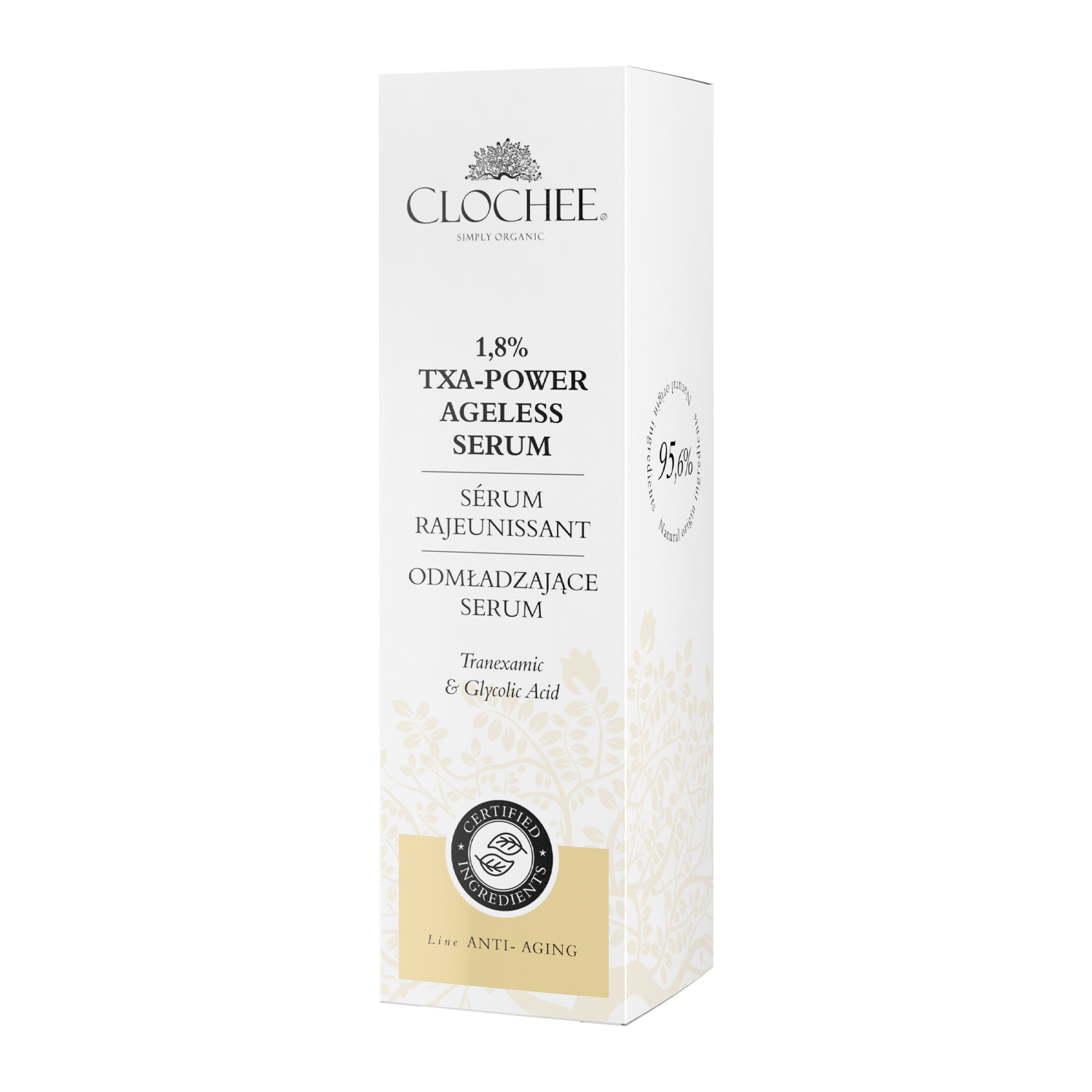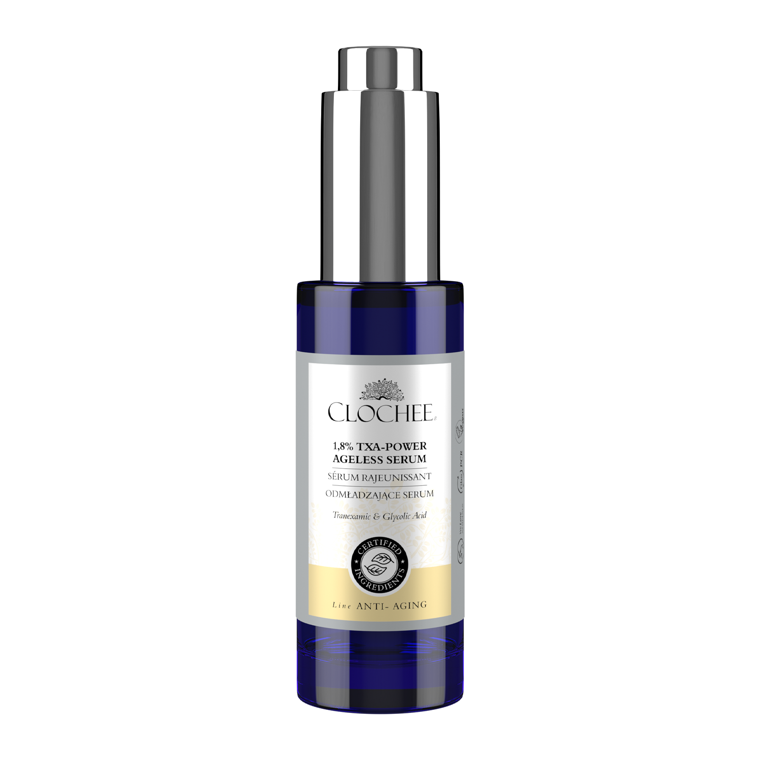 Clochee - 1,8% TXA Power - Omlazující sérum redukující pigmentové skvrny - pleťové sérum na obličej s účinkem vyrovnání tónu pleti a zpomalení tvorby vrásek. Obsahuje kyselinu tranexamovou v koncentraci 1,8 %, která je dostatečně vysoká na to, aby tato složka účinně zesvětlovala barevné změny a vyrovnávala tón pleti. Obsah antioxidačních složek, jako je kyselina ferulová a extrakt z květů ibišku, navíc neutralizuje škodlivé účinky volných radikálů, se kterými je pleť v každodenním kontaktu. Celé složení bylo sestaveno z přírodních a veganských ingrediencí.