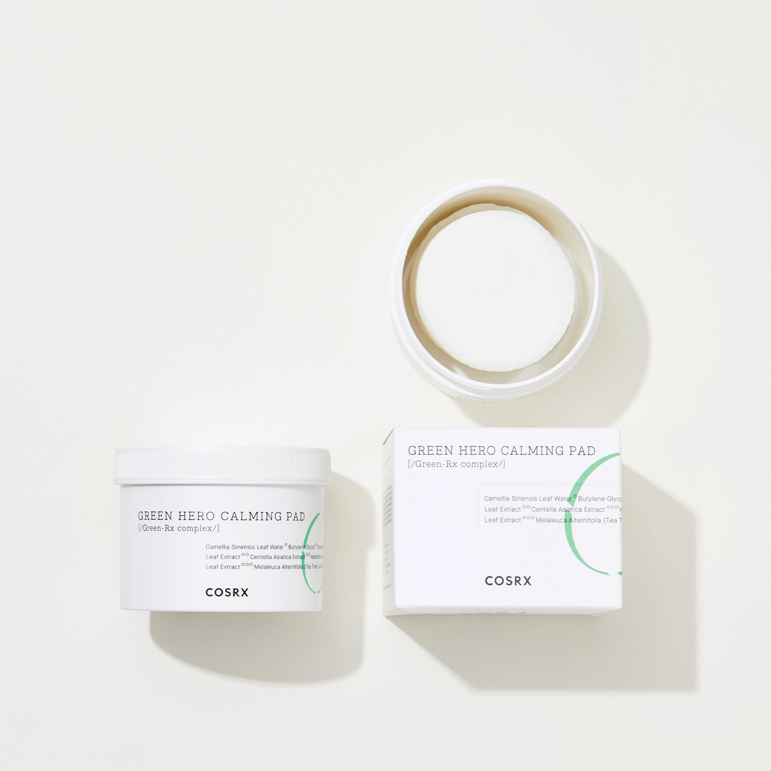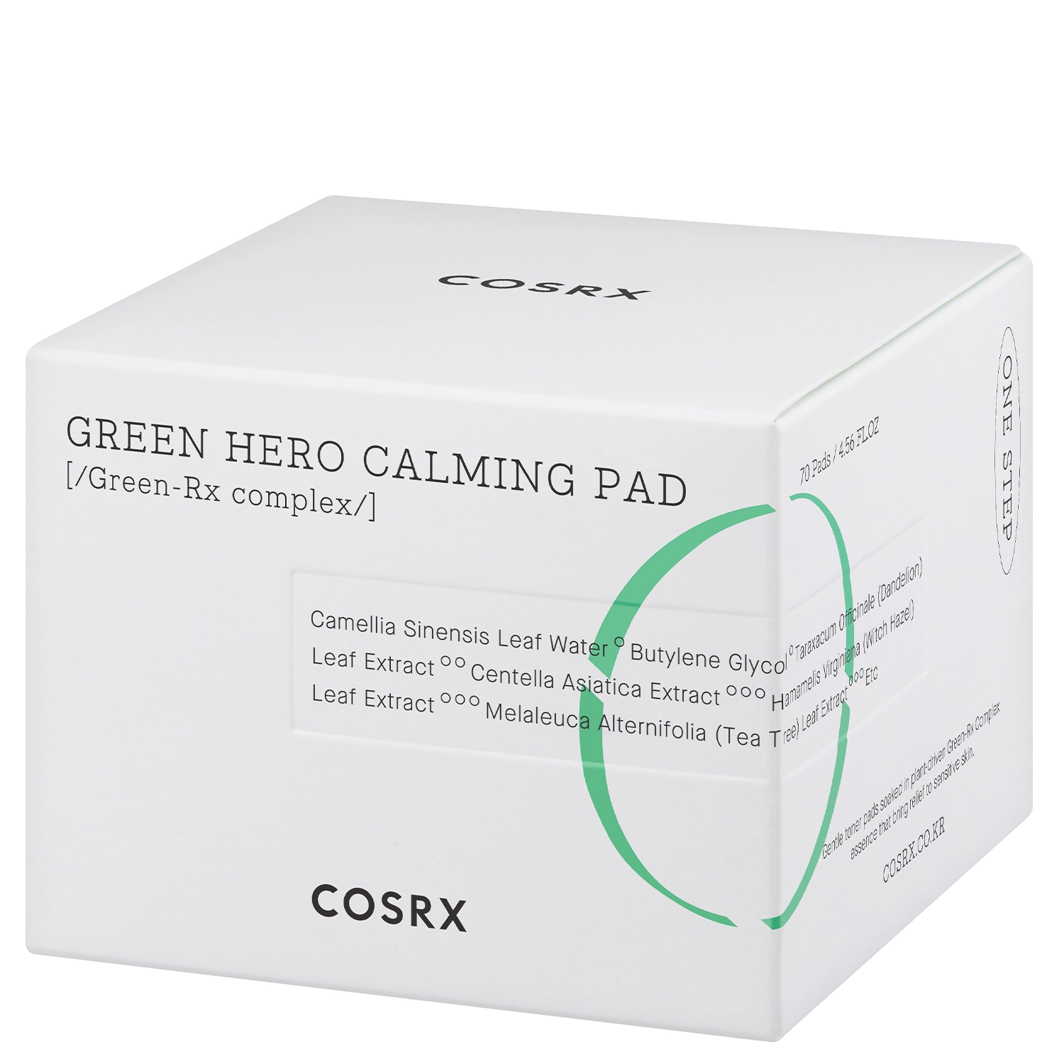 COSRX - One Step Green Hero Calming Pad - pleťové tampony s hydrolátem ze zeleného čaje, který má výborné protizánětlivé a zklidňující účinky. Přípravek byl vyroben na základě rostlinného komplexu Green-Rx, který se skládá z extraktu z pampelišky, extraktu z pupečníku asijského a hydrolátu z vilínu virginského, které regenerují pokožku, zmírňují podráždění a zklidňují a poskytují antioxidační ochranu. Přípravek byl obohacen o kyselinu laktobionovou s hydratačními, změkčujícími, vyhlazujícími a zklidňujícími vlastnostmi. Díky obsaženým látkám jsou tampony ideální pro péči o citlivou, problematickou a aknózní pokožku vyžadující zklidnění a regeneraci. Každý pleťový tampon se skládá ze dvou částí: vypouklá strana vyhlazuje, hladká hydratuje.