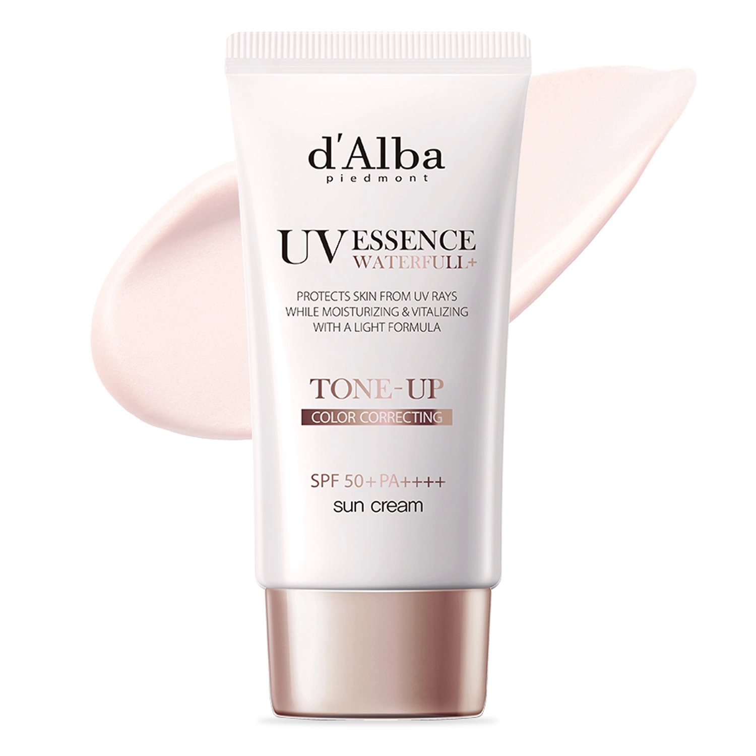 d'Alba - Waterfull Tone-Up Sun Cream SPF50+ PA++++ - pleťový krém s vysokou ochranou proti slunečnímu záření, jehož jemně tónované složení koriguje nedokonalosti pleti, sjednocuje její tón a funguje jako podklad pod make-up. Složení přípravku obsahuje smíšené filtry, které poskytují vysokou ochranu proti UVA a UVB záření SPF50+ a PA++++. Díky přídavku rostlinných výtažků, včetně bílého lanýže, broskve a Centella Asiatica, je krém hydratační, zpevňující a antioxidační, a díky přídavku panthenolu a alantoinu zklidňuje podráždění. Složení krému je obohaceno o příjemnou citrusovou vůni, je veganské a účinně se vstřebává. Přípravek zanechává pokožku jemně rozjasněnou a chráněnou před UV zářením.