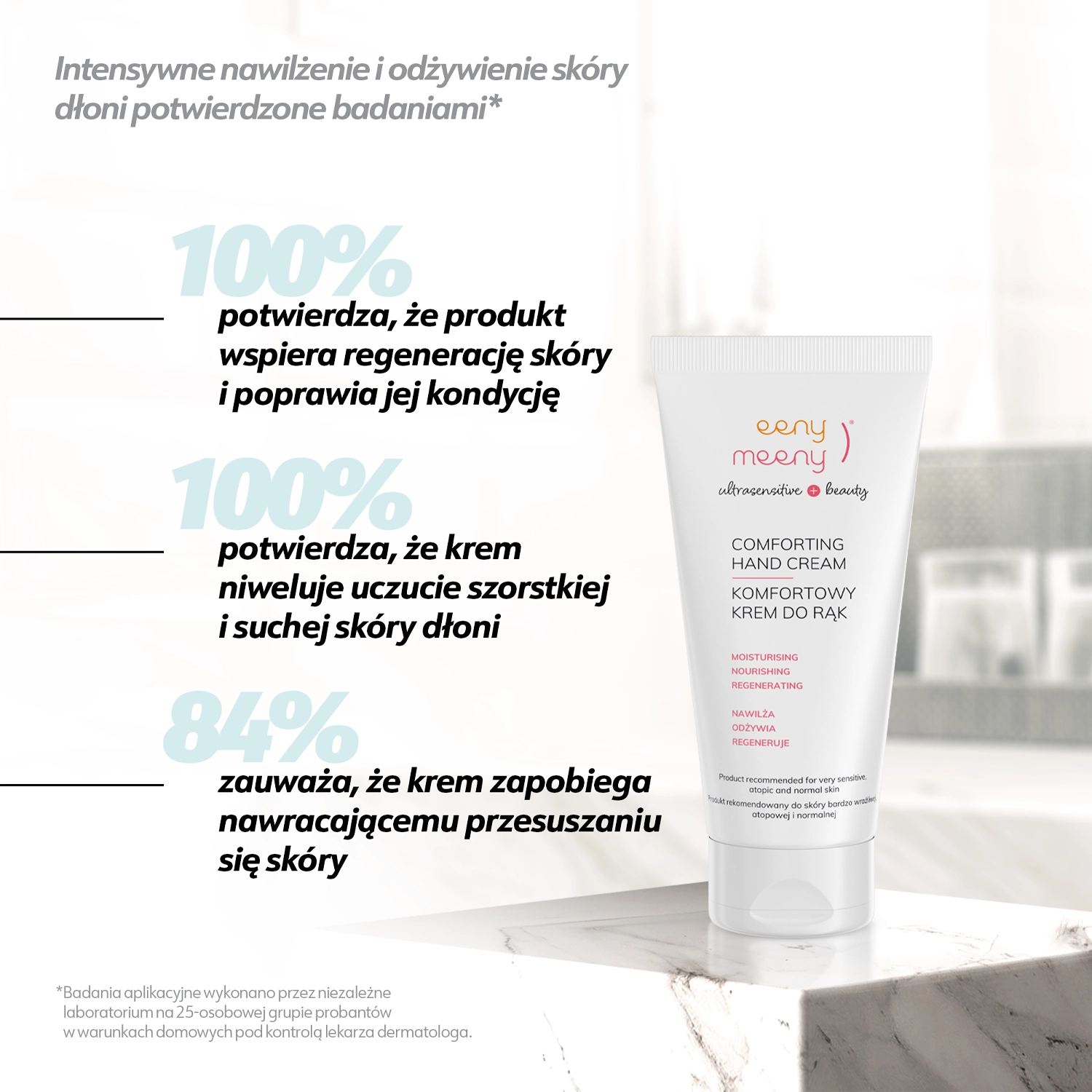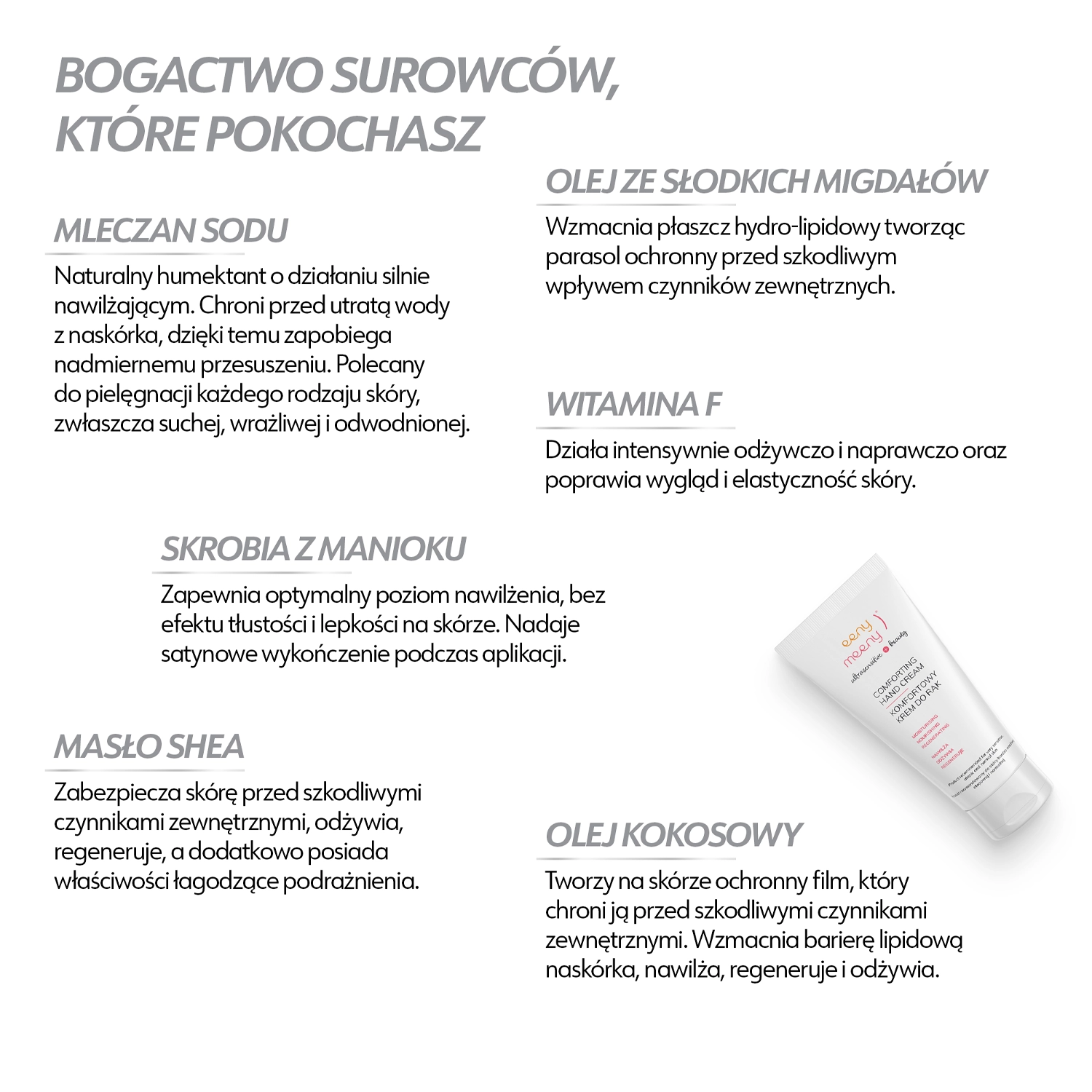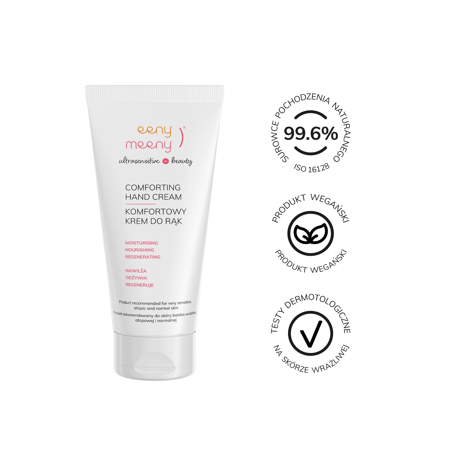 Eeny Meeny - Comforting Hand Cream - krém přináší úlevu suchým a popraskaným rukám. Obsahuje olej ze sladkých mandlí a kokosový olej, které posilují ochrannou bariéru pokožky, bambucké máslo, které zklidňuje podráždění a regeneruje a hořčičný olej, který hydratuje a vyhlazuje pokožku. Krém má příjemnou konzistenci, rychle se vstřebává a nezanechává lepivý film. Veganský produkt na bázi 99,6 % složek přírodního původu.