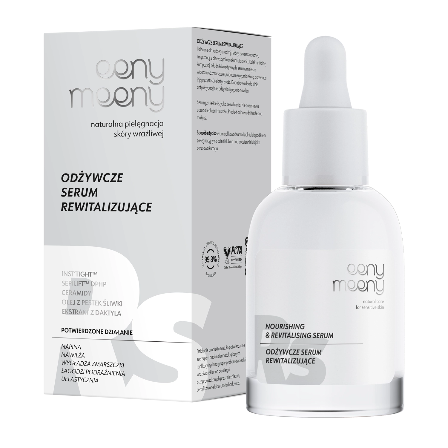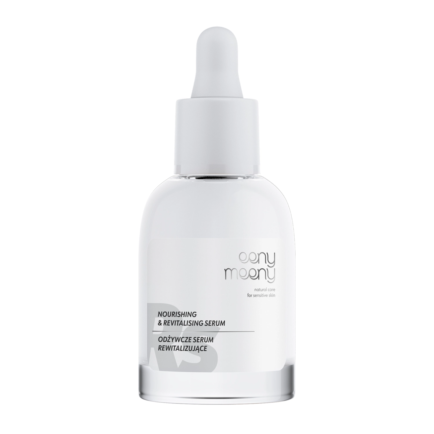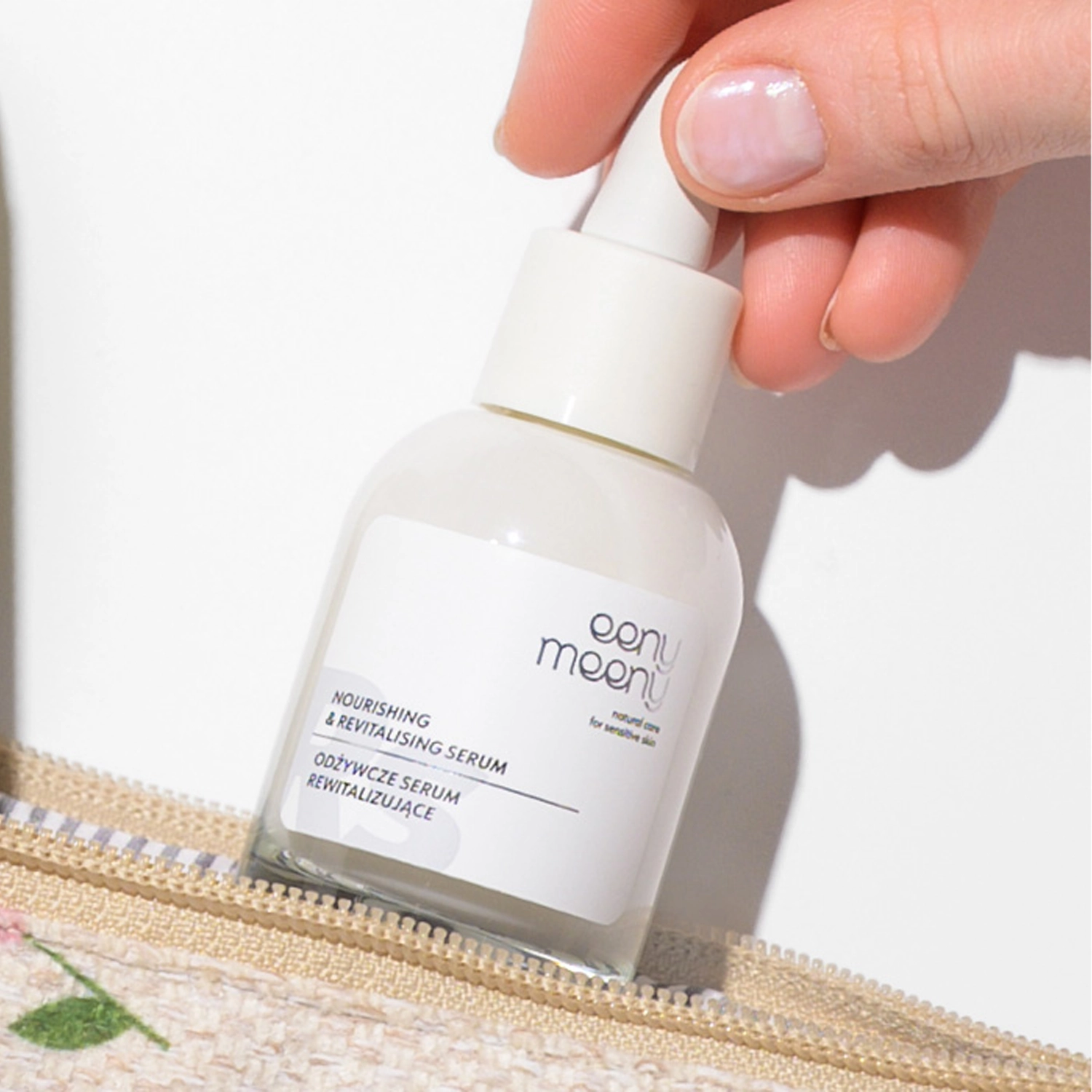 Eeny Meeny - Nourishing & Revitalising Serum - vyživující sérum s mléčnou konzistencí emulze pro všechny typy pleti, zejména pro pleť vyžadující regeneraci. Má intenzivní vůni. Obsahuje ceramidy, které posilují ochrannou bariéru pokožky, chrání před vysoušením a vznikem podráždění a regeneruje, kyselinu hyaluronovou, která váže vodu v pokožce a zajišťuje dostatečnou úroveň hydratace, hydrolyzované glykosaminoglykany, které podporují hydratační účinky přípravku, změkčují, vyhlazují, opticky napínají jemné vrásky a zlepšují elasticitu pleti, skvalan, který vyživuje, olej ze švestkových jader, který regeneruje a působí proti stárnutí a extrakt z datlí, který zpevňuje, zlepšuje elasticitu pleti a intenzivně vyživuje. Přípravek na bázi 99,8 % složek přírodního původu.