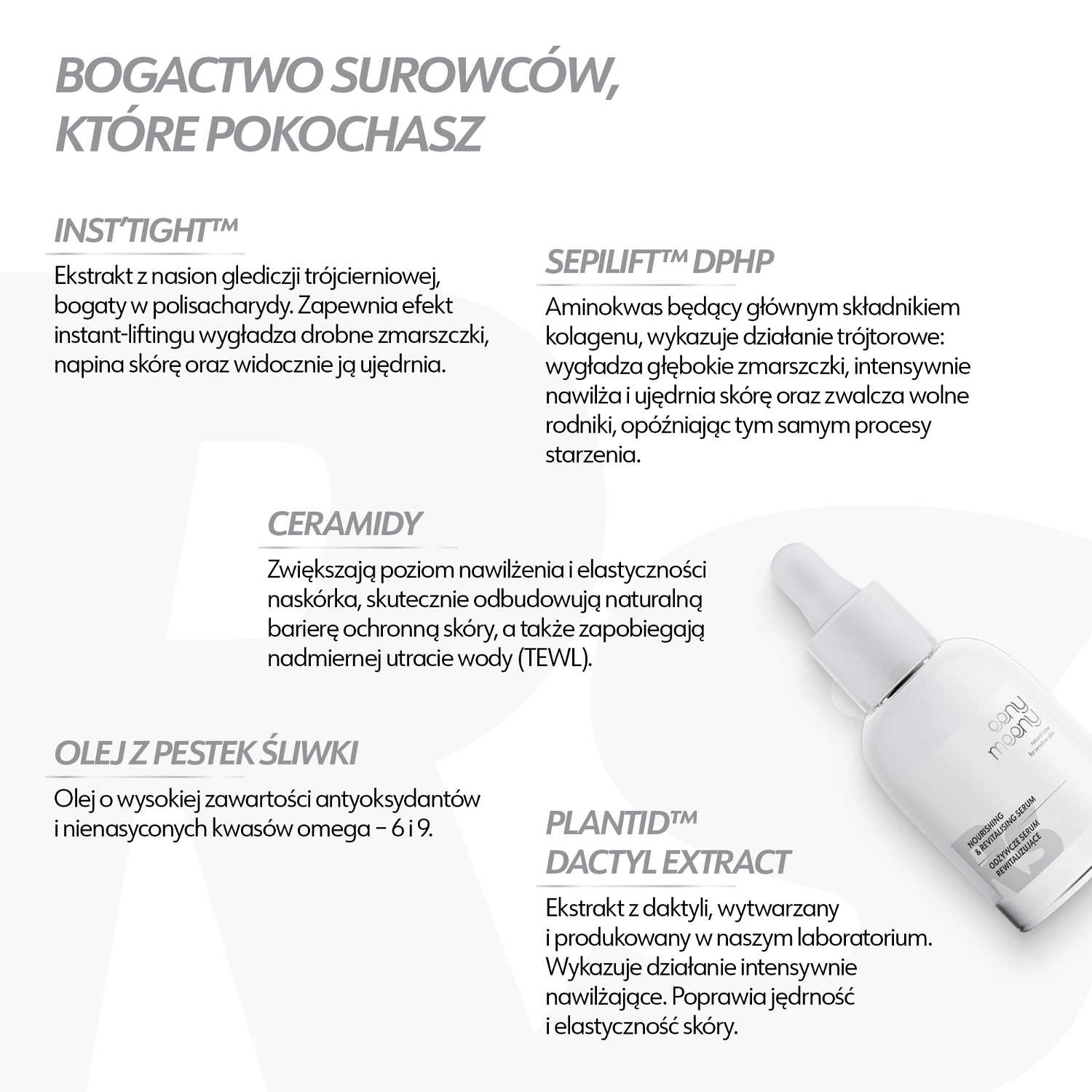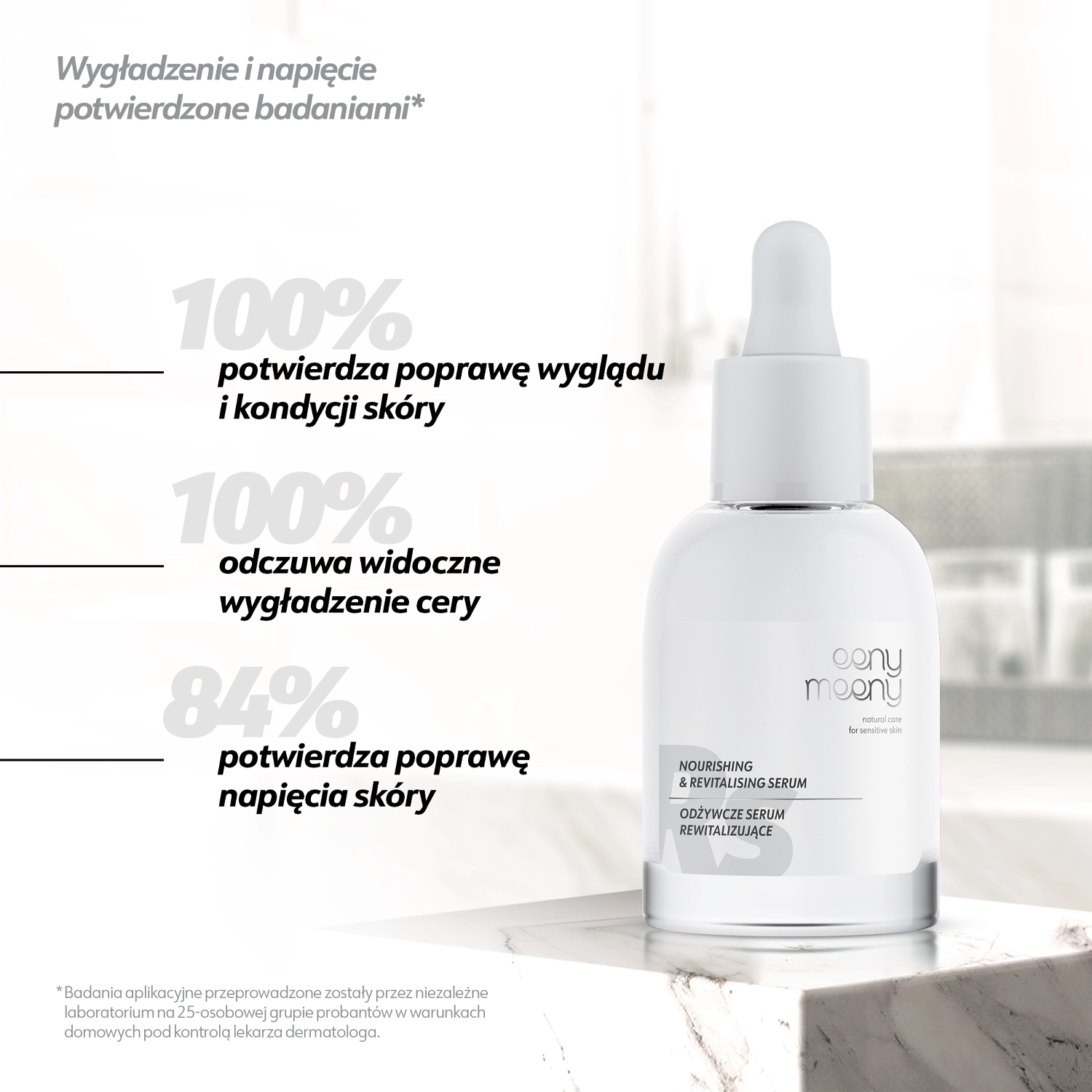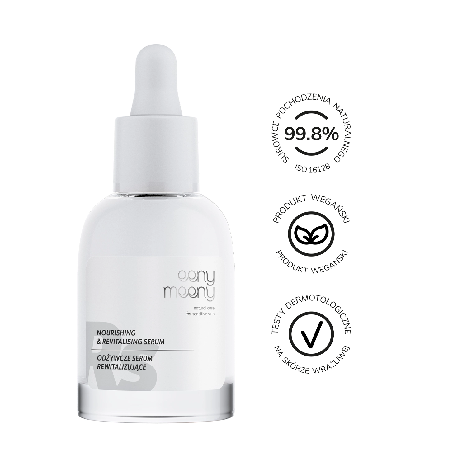 Eeny Meeny - Nourishing & Revitalising Serum - vyživující sérum s mléčnou konzistencí emulze pro všechny typy pleti, zejména pro pleť vyžadující regeneraci. Má intenzivní vůni. Obsahuje ceramidy, které posilují ochrannou bariéru pokožky, chrání před vysoušením a vznikem podráždění a regeneruje, kyselinu hyaluronovou, která váže vodu v pokožce a zajišťuje dostatečnou úroveň hydratace, hydrolyzované glykosaminoglykany, které podporují hydratační účinky přípravku, změkčují, vyhlazují, opticky napínají jemné vrásky a zlepšují elasticitu pleti, skvalan, který vyživuje, olej ze švestkových jader, který regeneruje a působí proti stárnutí a extrakt z datlí, který zpevňuje, zlepšuje elasticitu pleti a intenzivně vyživuje. Přípravek na bázi 99,8 % složek přírodního původu.