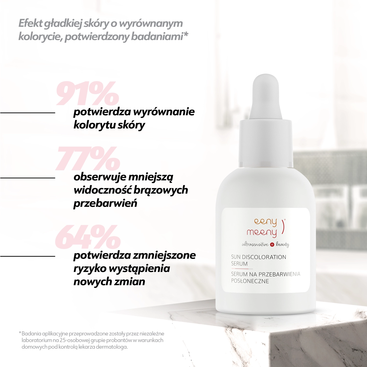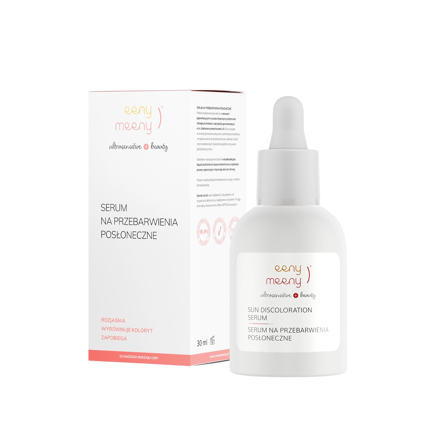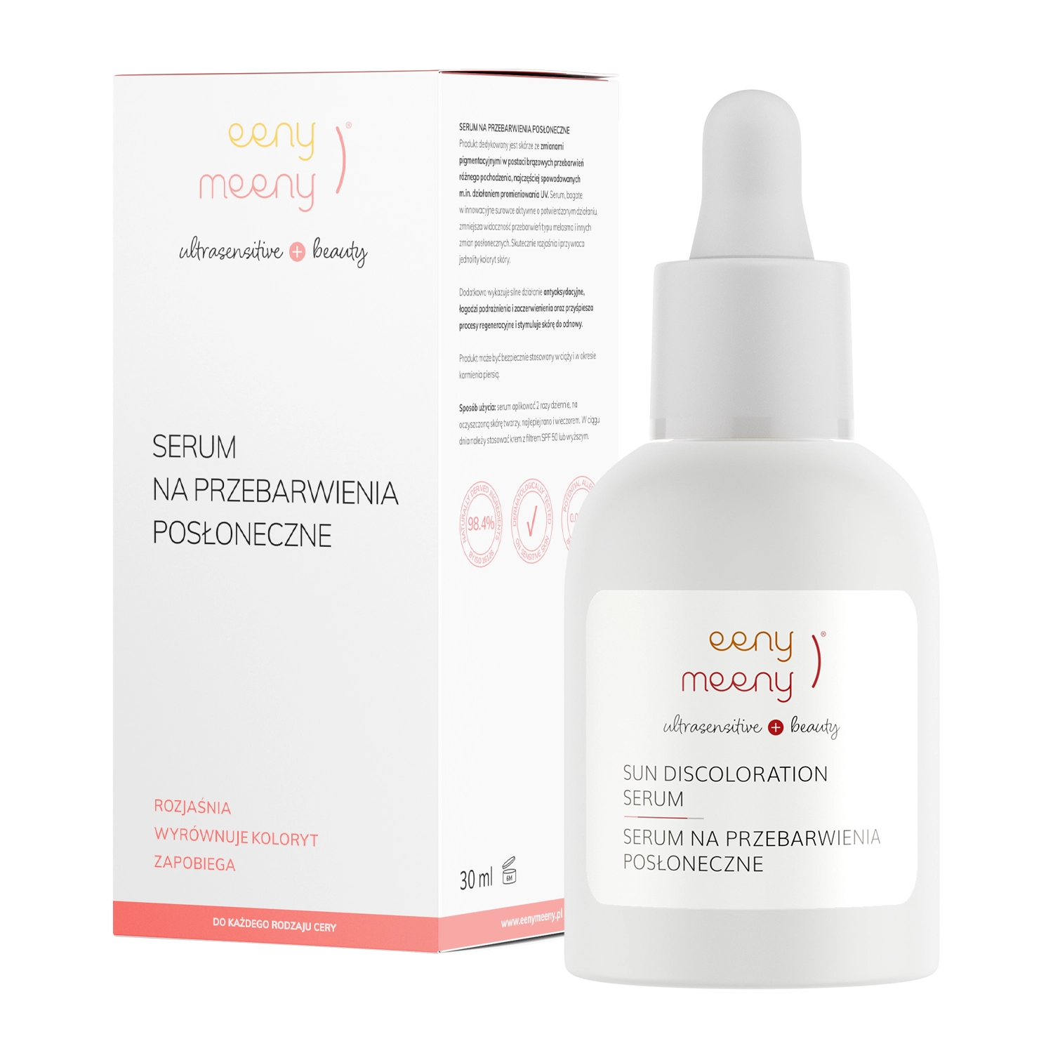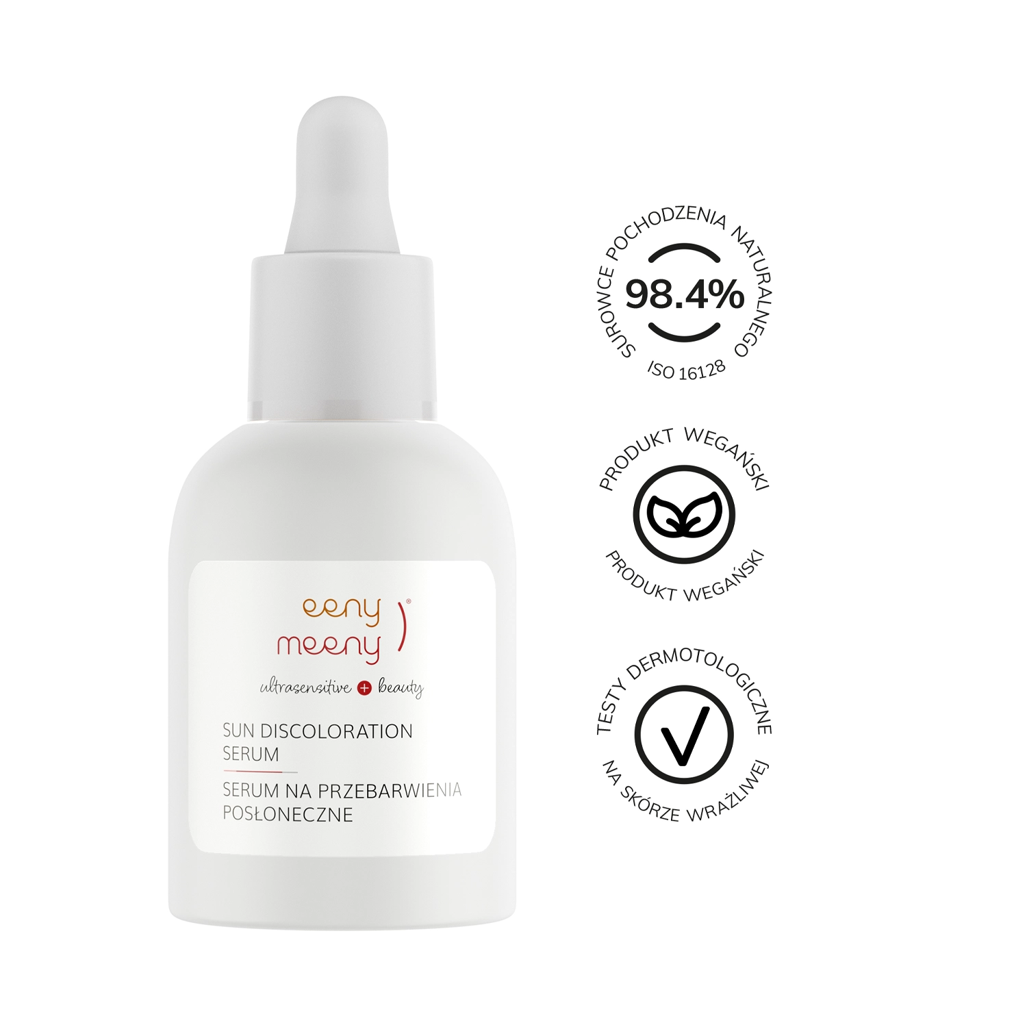 Eeny Meeny - Sun Discoloration Serum - sérum pro pokožku s hnědými pigmentovými skvrnami ze slunce. Obsahuje inovativní složky LIGHTDERM GLY a EPS BRIGHT PA, které rozjasňují a zesvětlují, čímž sjednocují tón pleti, extrakt ze švestky Kakadu, který je bohatý na vitamín C a podporuje rozjasňující účinky, extrakt z kůry bílé vrby, který exfoliuje zrohovatělou vrstvu pokožky a kyselinu hyaluronovou, která zvyšuje úroveň hydratace. Veganský produkt na bázi 98,4 % složek přírodního původu. Bezpečný pro těhotné a kojící ženy.