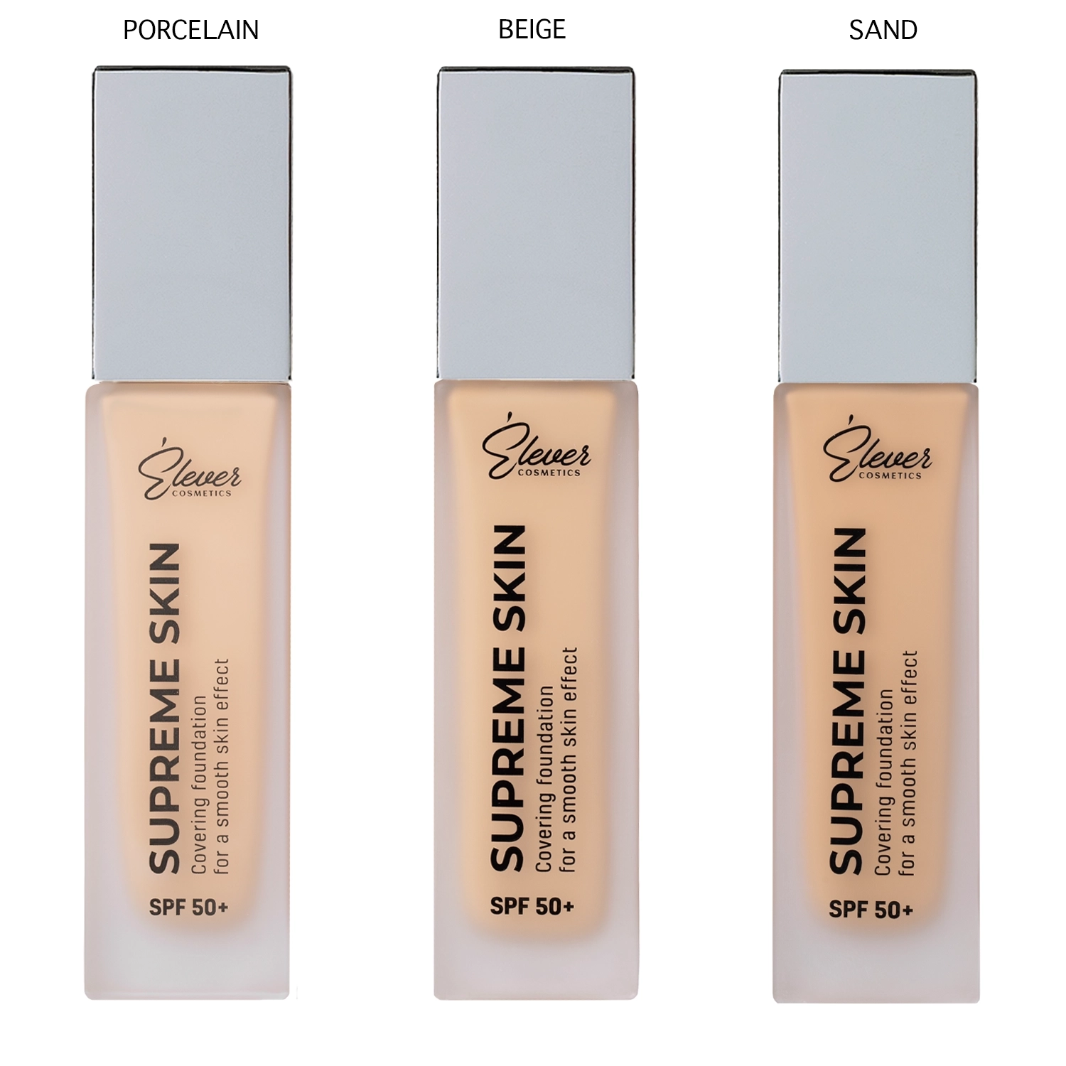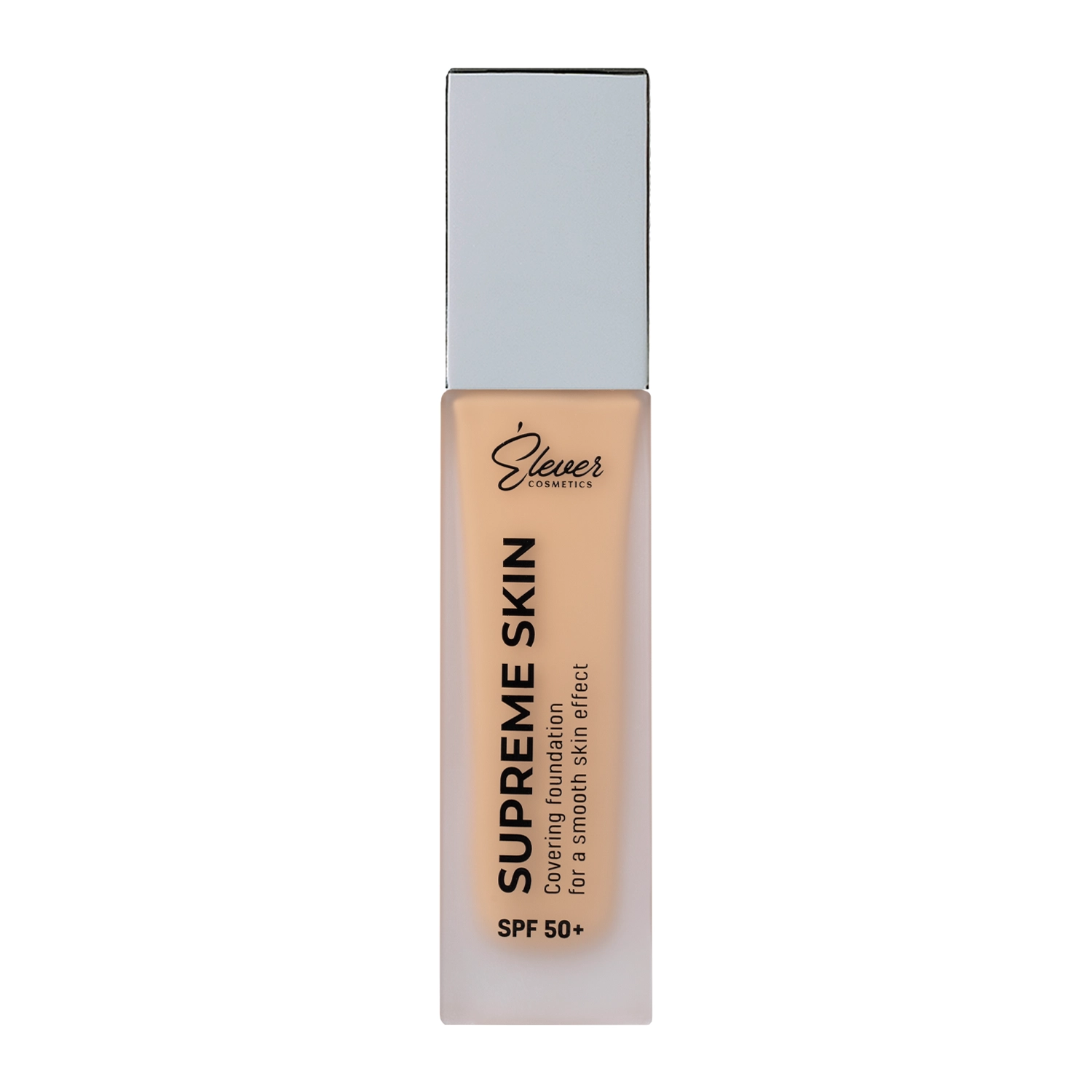 Elever Cosmetics - Supreme Skin SPF50+ - make-up s lehkou konzistencí a saténovým finishem. Obsahuje hyaluronát sodný, který hydratuje a vyhlazuje. Střední krytí lze stupňovat až po plné. Složení make-upu nezatěžuje pleť, neslévá se a nežmolkuje. Další obsažené složky zajišťují dlouhotrvající efekt na dlouhé hodiny. Přídavek byl obohacen o fyzikální filtry, které podporují ochranu před slunečním zářením. Make-up můžete nanášet na bázi nebo krém. Veganský produkt.