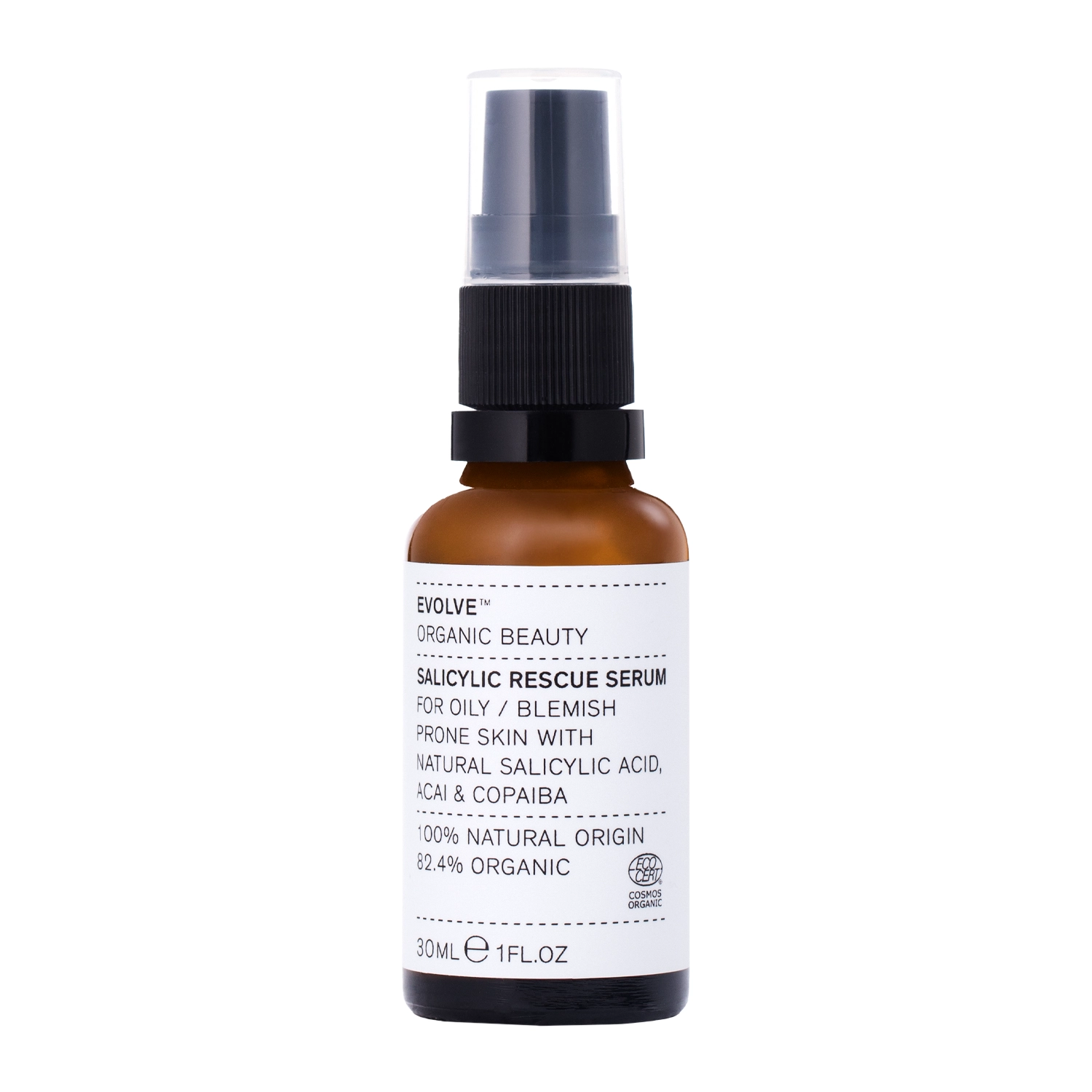 Evolve Organic Beauty - Rainforest Rescue Blemish Serum - sérum pro problematickou pleť se sklonem k akné. Na bázi šťávy z aloe vera, která hydratuje a zklidňuje. Bylo obohaceno o extrakt z bílé vrby, který je zdrojem BHA kyselin; jemně exfoliuje, čistí ucpané póry a předchází vzniku nových pupínků a nedokonalostí, pryskyřici Copaiba, která má protizánětlivé a antibakteriální účinky, redukuje práci mazových žláz a minimalizuje sekreci kožního mazu, andiroba olej, který zklidňuje zánětlivé projevy a minimalizuje zarudnutí a acai olej, který posiluje stěny krevních cév a posiluje fungování hydrolipidové bariéry. Sérum účinně redukuje zánětlivé projevy, minimalizuje podráždění, urychluje proces regenerace a reguluje práci mazových žláz. Vyrobeno ze složek přírodního původu, je vhodný pro vegany a je v souladu s myšlenkou less-waste.