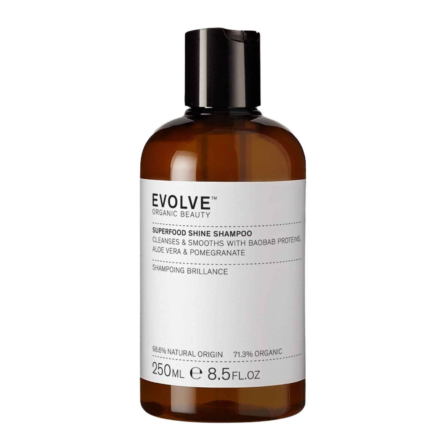 Evolve Organc Beauty - Superfood Shine Shampoo - přírodní šampon pro lesk vlasů. Jemně odstraňuje nečistoty z pokožky hlavy bez podráždění. Obsahuje proteiny ze semen baobabu, které doplňují ztráty ve struktuře vlasu a vyživují, extrakt z granátového jablka, který čistí pokožku hlavy a reguluje sekreci mazu a dužninu z aloe vera, která zklidňuje, hydratuje, změkčuje a má antibakteriální účinky.