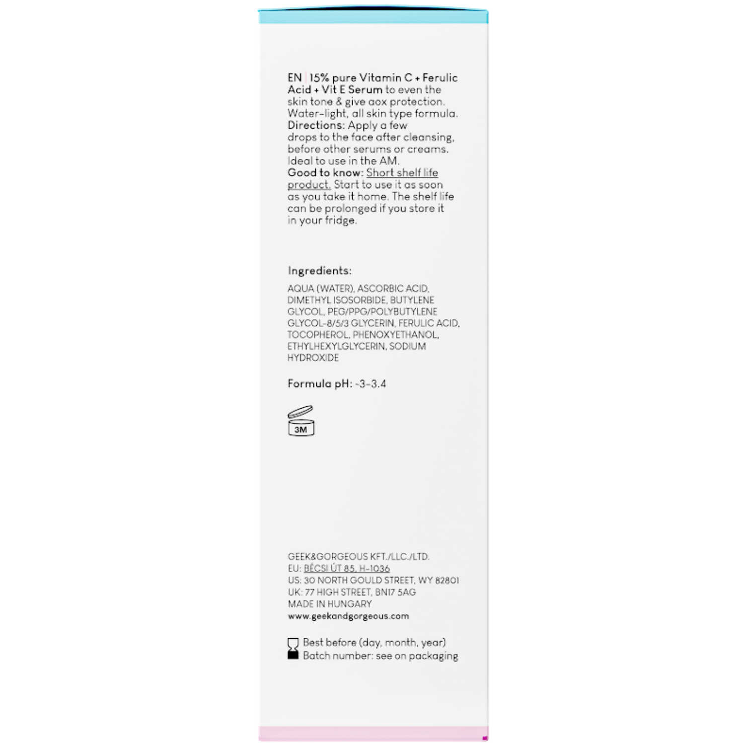 Geek & Gorgeous - C-Glow - působí proti vráskám sérum obsahující tři složky se silnými antioxidačními účinky. Vitamin C v koncentraci 15 % kromě boje proti volným radikálům ovlivňuje syntézu kolagenu, čímž zpomaluje procesy stárnutí pleti, a vyrovnává tón pleti, čímž snižuje výskyt barevných změn. Sérum je obohaceno o kyselinu ferulovou a vitamin E, které jsou rovněž antioxidanty a ovlivňují stabilitu vitaminu C a podporují jeho působení. Sérum má lehké složení na vodní bázi a rychle se vstřebává. Má pH 3,2-3,4. Je vhodné pro všechny typy pleti, která potřebuje antioxidaci a vyrovnání barev, s výjimkou citlivé pleti, na kterou může koncentrace kyseliny askorbové a nízké pH přípravku působit dráždivě. Kosmetický přípravek je veganský.