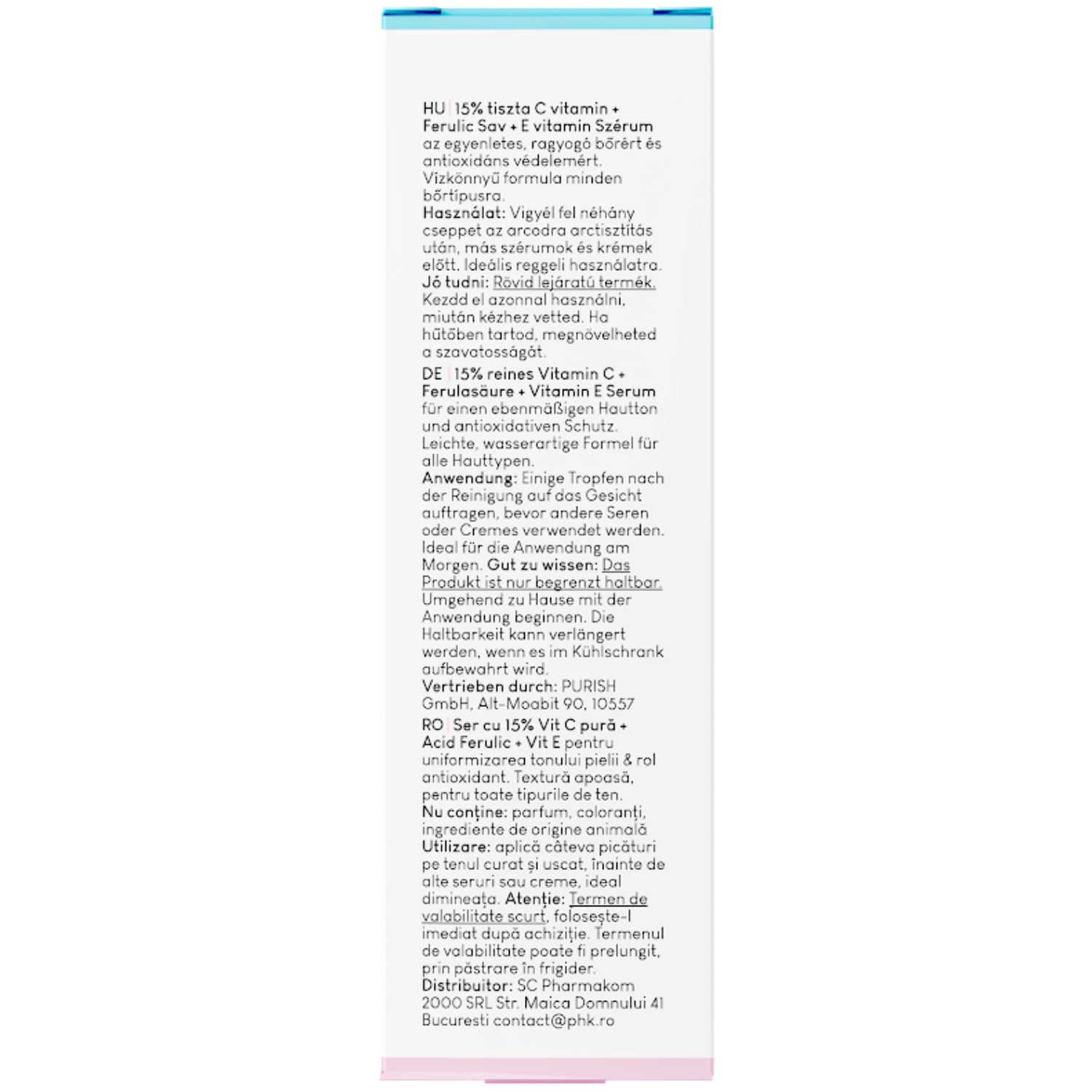 - vitamín C 15 % (ve formě kyseliny L-askorbové ) - má antioxidační a anti-aging účinek, rozjasňuje a vyrovnává tón pleti, posiluje stěny cév, podporuje tvorbu kolagenu