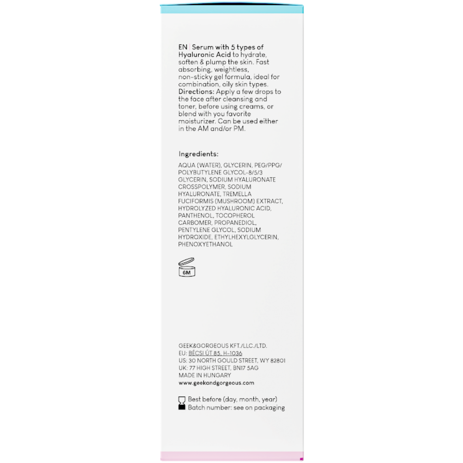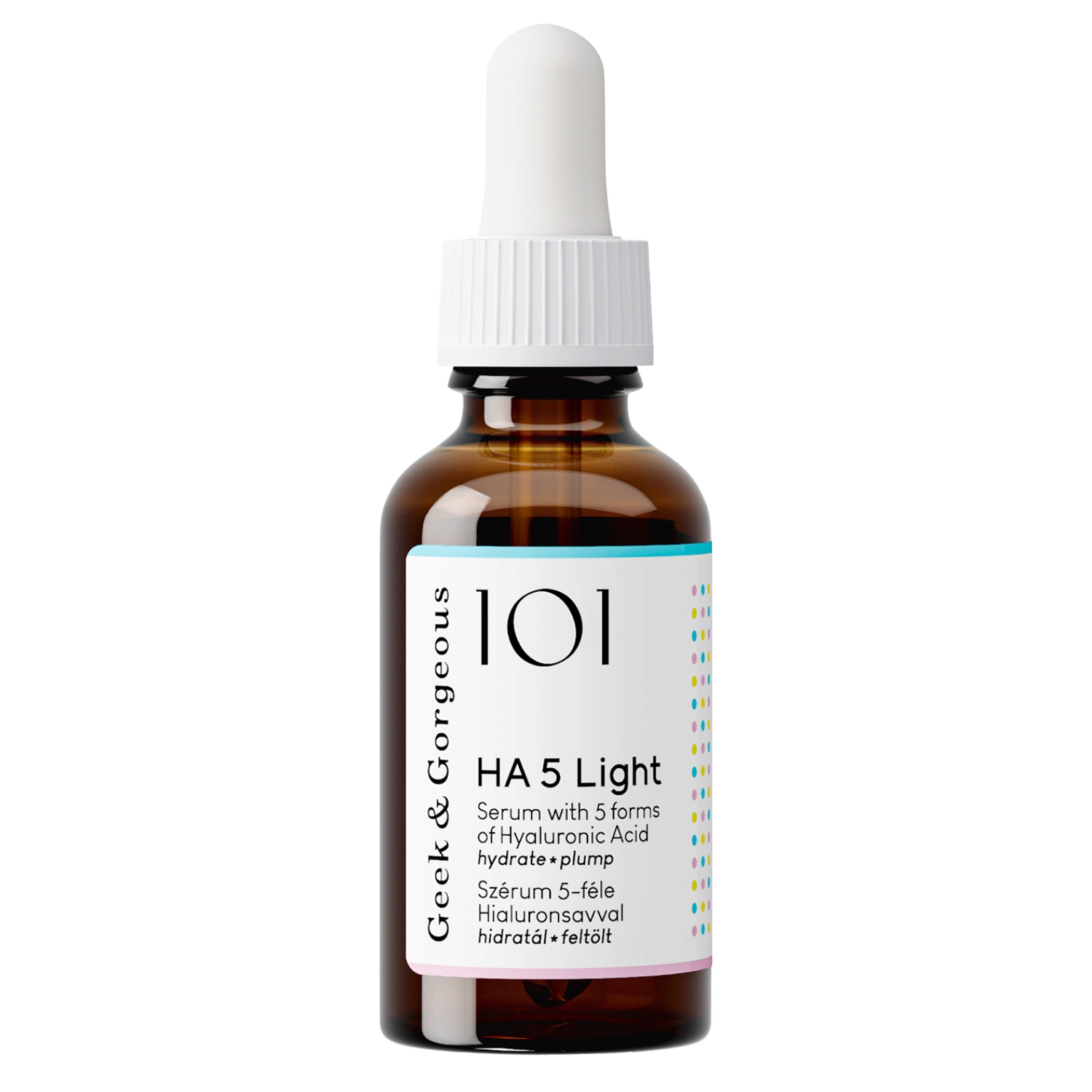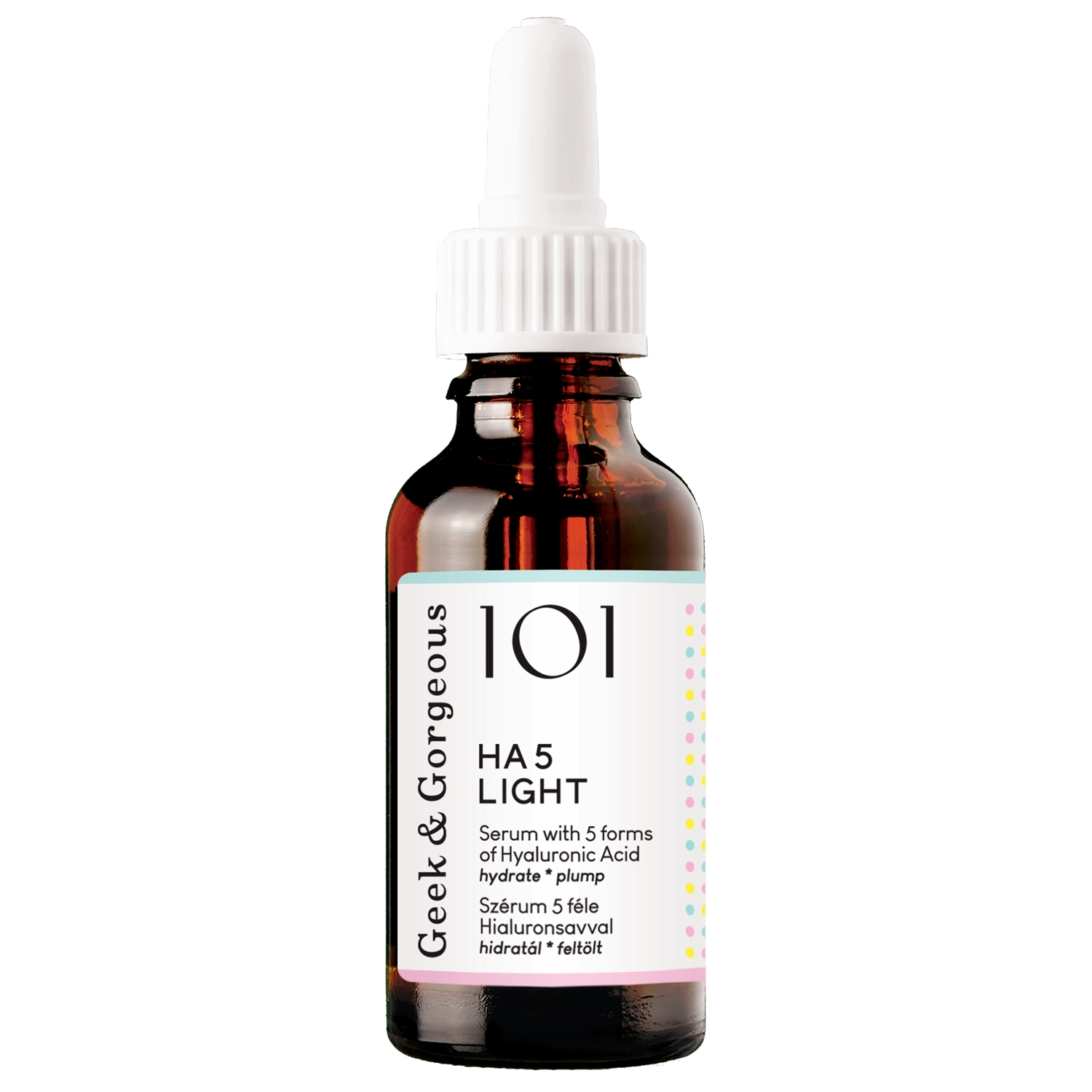Geek & Gorgeous - HA 5 Light - sérum s 5 formami kyseliny hyaluronové pro intenzivní hydrataci, vypnutí a vyhlazení pleti. Bylo obohaceno o výtažek z houby - škrabky s hydratačními a antioxidačními vlastnostmi a panthenol, který vyrovnává pleť podráždění. Sérum poskytuje pleti dostatečné hydratace, posiluje kožní bariéru a zjemňuje pokožka. Má lehkou gelovou texturu, která se rychle vstřebává a nezanechává lepkavý pocit, takže je nejvhodnější pro mastnou a smíšenou pleť, která potřebuje hydrataci. Má pH 4,5-5,5 a produkt je veganský.