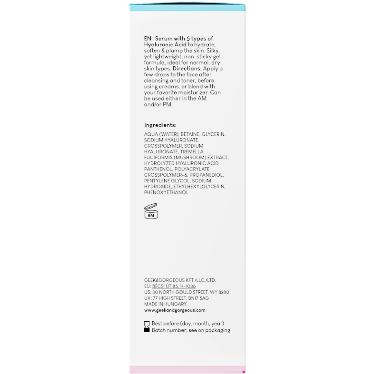 Geek & Gorgeous - HA 5 Rich - sérum s 5 formami kyseliny hyaluronové pro intenzivní hydrataci, vypnutí a vyhlazení pleti. Bylo obohaceno o výtažek z houby - škrabky s hydratačními a antioxidačními vlastnostmi a panthenol, který vyrovnává pleť podráždění. Sérum dodává pleti dostatek hydratace, posiluje kožní bariéru a zjemňuje pokožka. Má hladkou gelovou texturu, která nezanechává lepkavý pocit. Nejlépe působí na suchou a normální pleť. Má pH 4,5-5,5 a kosmetický přípravek je veganský.
