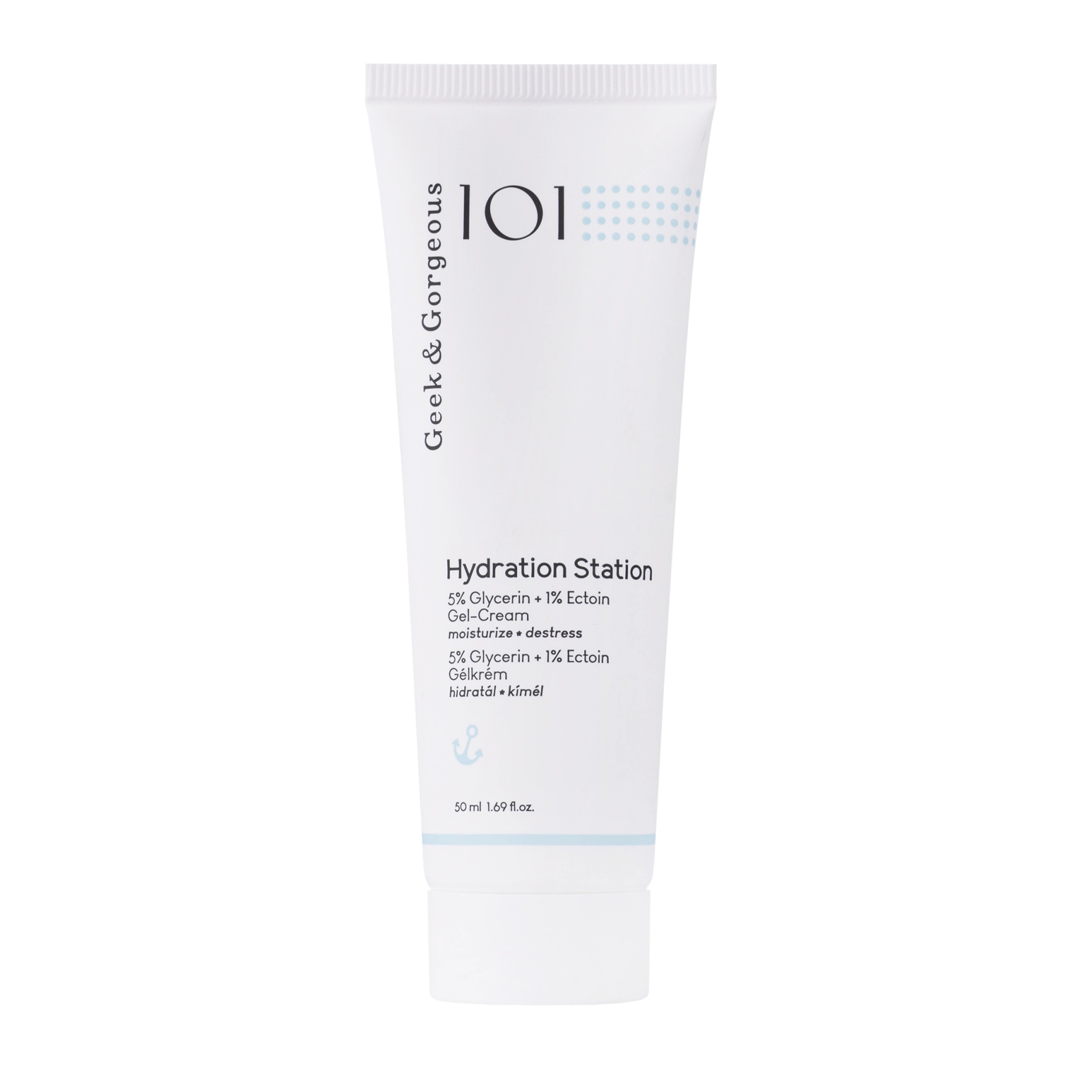 Geek&Gorgeous - Hydration Station - krém-gel s lehkou, rychle se vstřebávající texturou. Obsahuje ektoin, který silně hydratuje pokožku a posiluje její ochrannou bariéru, a také zklidňující podráždění: bisabolol a alantoin. Přídavek vitaminu E navíc chrání pokožku před škodlivými účinky volných radikálů a předčasným stárnutím. Přípravek je ideální pod make-up a je vhodný pro vegany.