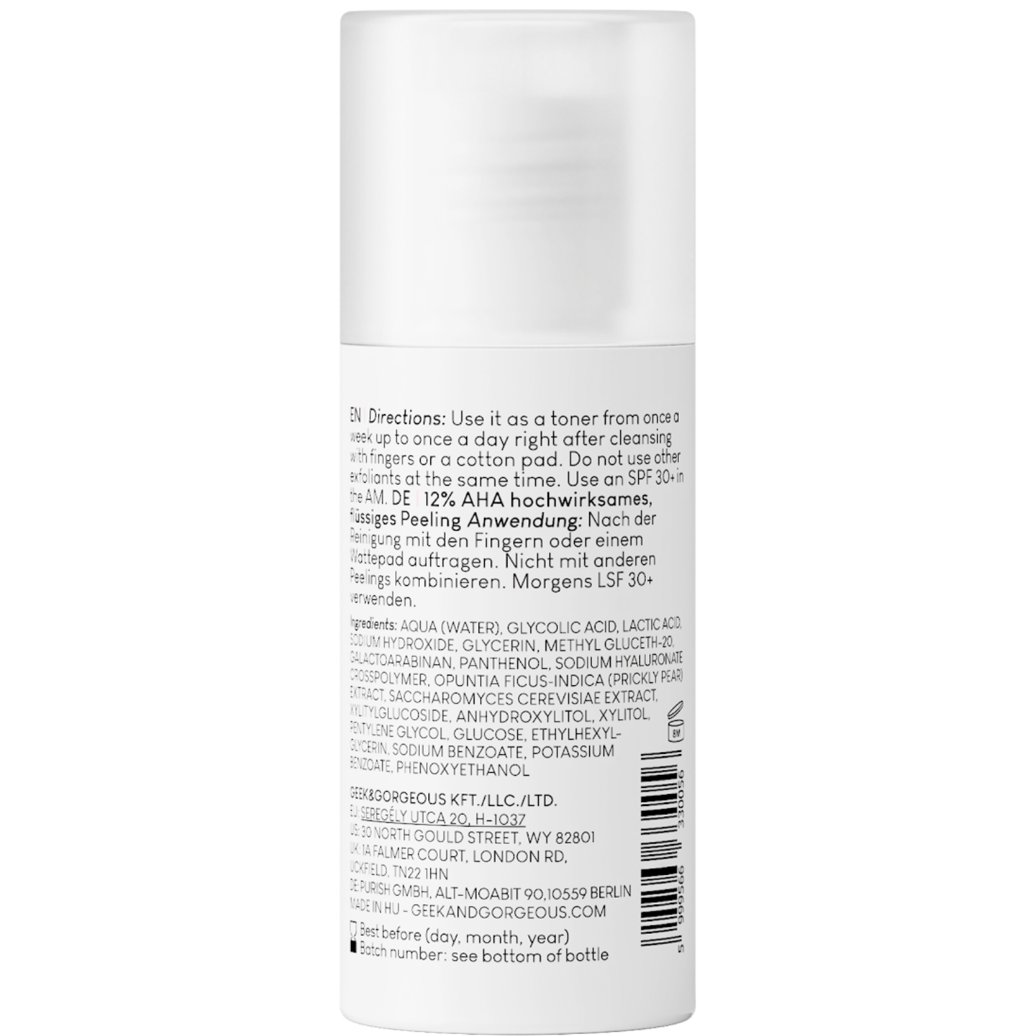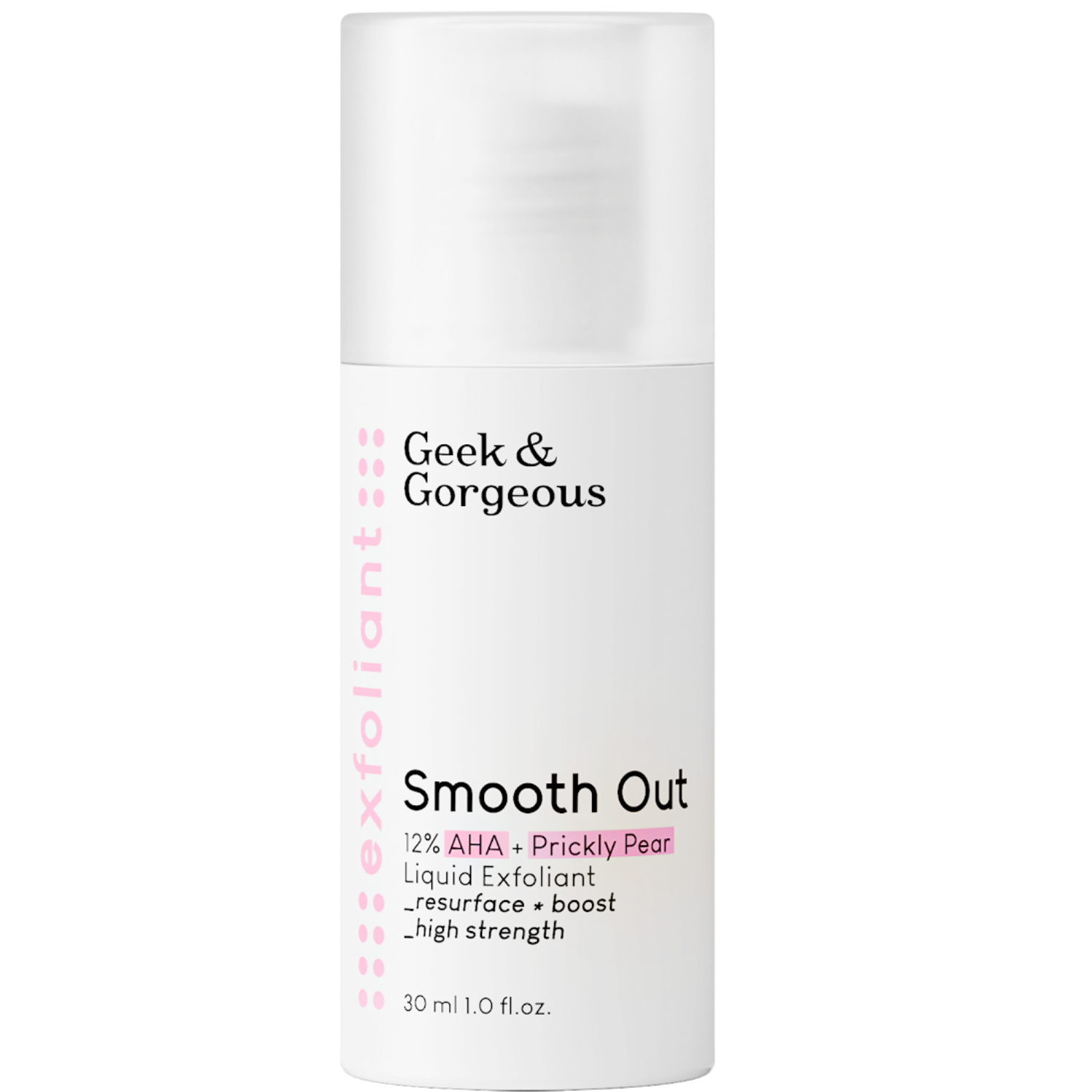 Geek & Gorgeous - Smooth Out - exfoliační přípravek s AHA kyselinami o celkové koncentraci 12 %. Kyselina glykolová exfoliuje pokožku, viditelně vyhlazuje povrch pleti a také jemné linky a vrásky, přičemž omezuje proces stárnutí a má depigmentační účinek. Kyselina mléčná pleť hydratuje a zjemňuje. Galaktarabiát zabraňuje úniku vody z pokožky a podporuje působení kyselin na pleť. Cukry zlepšují hydratace pleť, zatímco extrakt z opuncie, kvasnice a panthenol dále zklidňují pleť a neutralizují podráždění. Přípravek má pH 3,5-3,9. Při pravidelném používání přináší efekt jemné, hladké a zářivé pleti. Výrobek je veganský