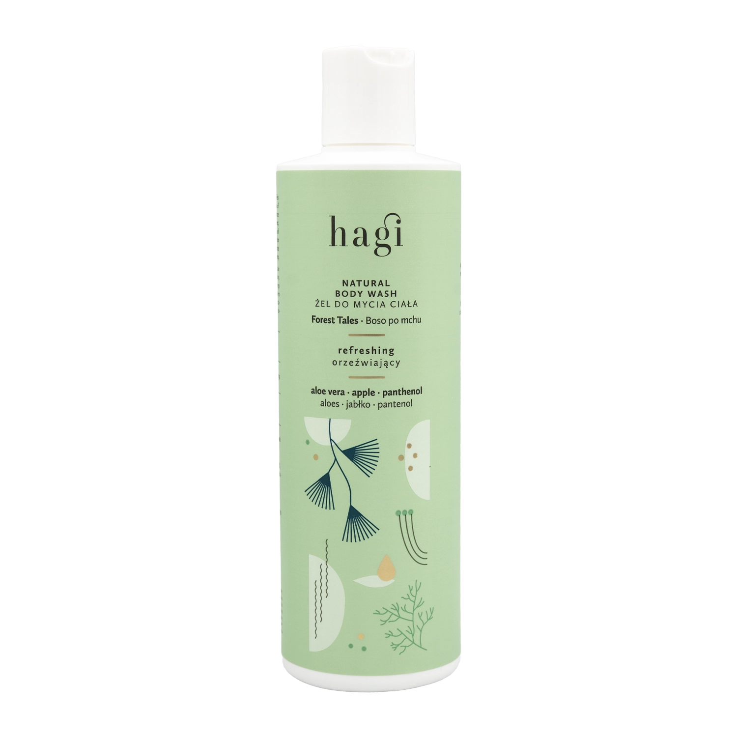 Hagi - Přírodní sprchový gel - Jako v lese - mycí gel na tělo, který zahalí pokožku osvěžující vůní jehličnatého lesa, přerušovanou citrusovými tóny, s jemným nádechem karamelu a smyslného pižma. Obsahuje šťávu z listů aloe vera, která hydratuje pokožku, zklidňuje podráždění a záněty a poskytuje uklidňující pocit. Kromě toho extrakt z jablek a panthenol podporují a urychlují přirozené regenerační procesy, zatímco prebiotikum inulin posiluje kožní mikrobiom. Celé složení doplňuje vitamin E, jeden z nejsilnějších antioxidantů, který neutralizuje škodlivé účinky volných radikálů. Gel se vyznačuje jemnou, příjemnou texturou, která se na pokožce hladce roztírá a vytváří sametovou pěnu.