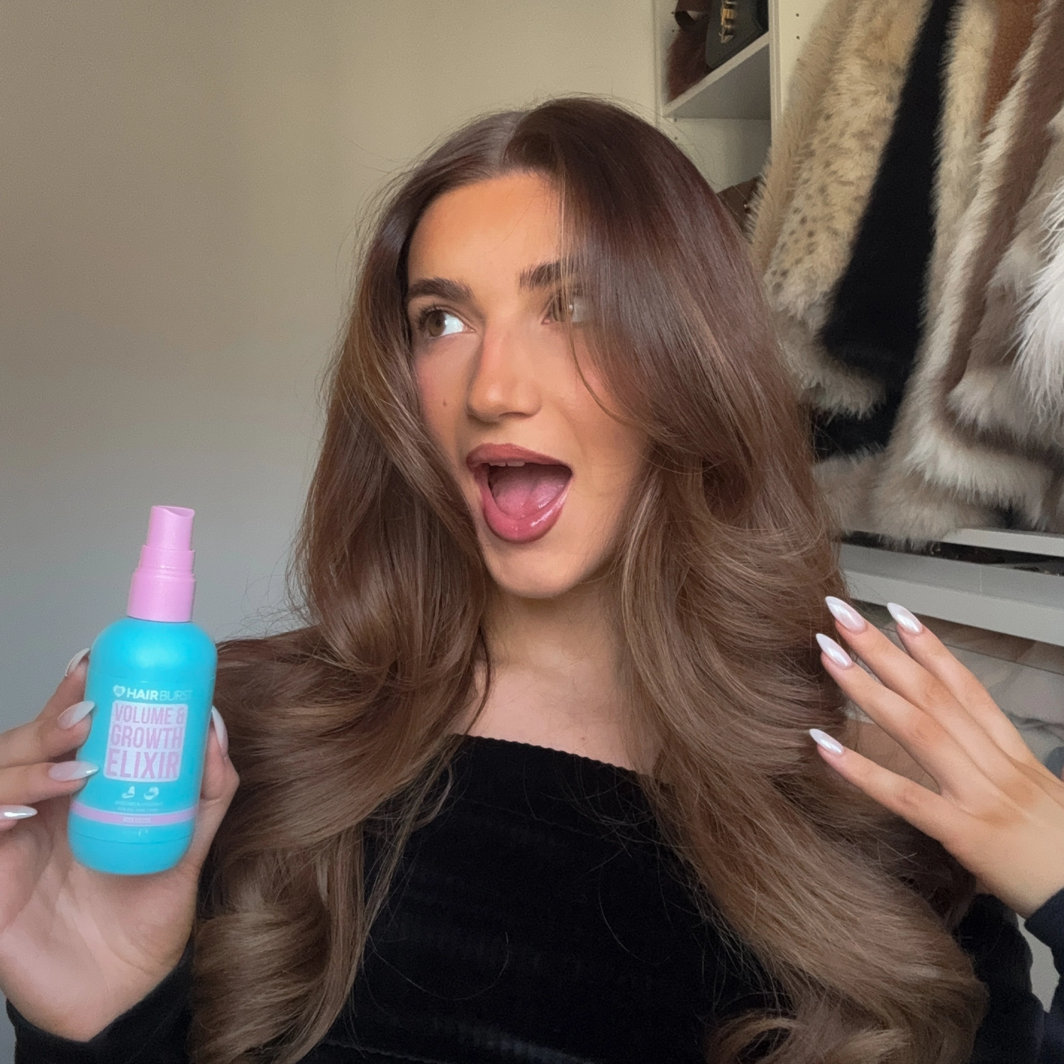 Hairburst - Elixir Volume & Growth Spray - sprej pro zvětšení objemu vlasů. Posiluje jemné vlasy a zlepšuje vzhled účesu. Navíc chrání před teplem při fénování a stylingu a snižuje negativní účinky UV záření na vlasový stonek. Složení spreje obsahuje hydratační panthenol, vyživující slunečnicový extrakt a hydrolyzované pšeničné proteiny, které mají posilující a uhlazující účinek. Výrobek je veganský.