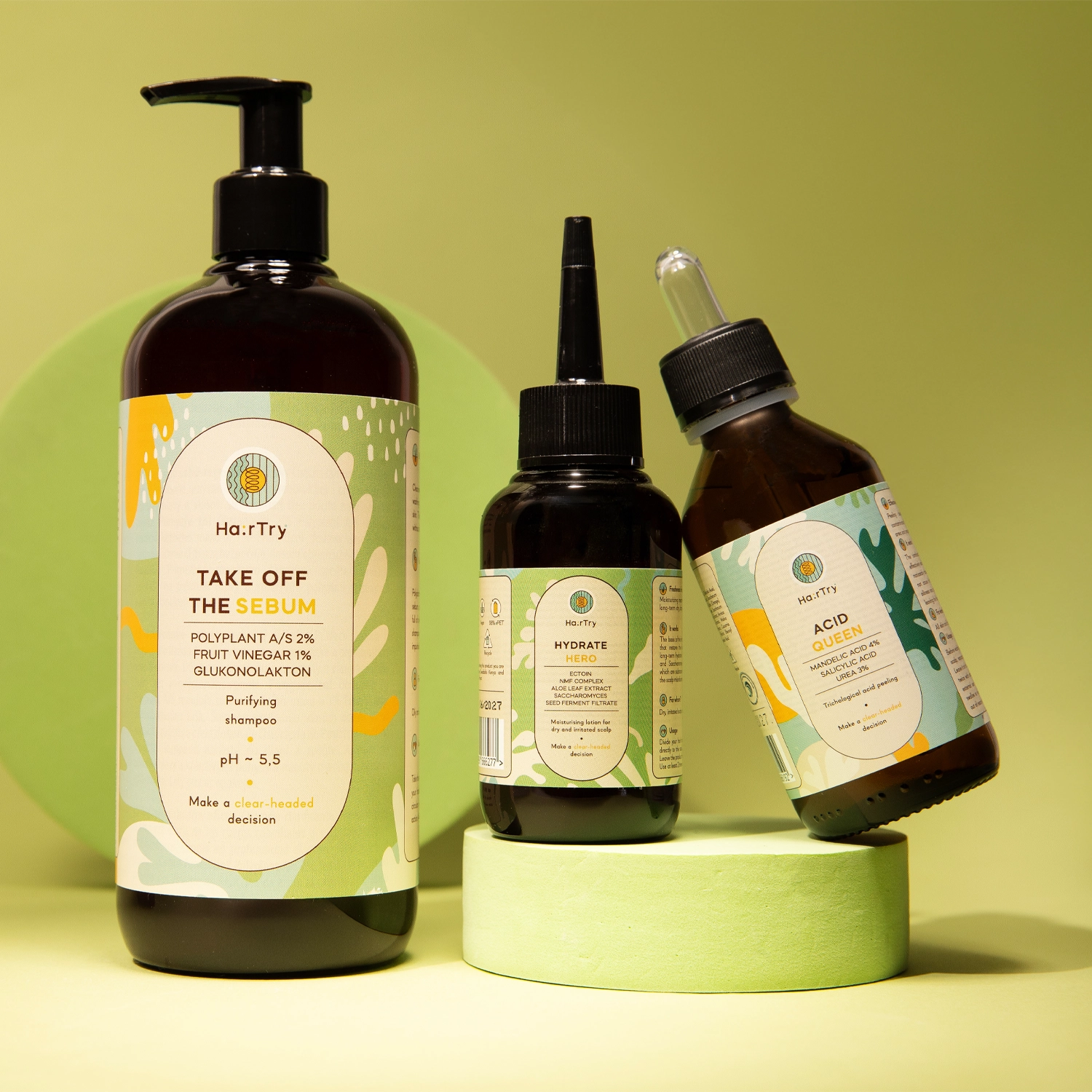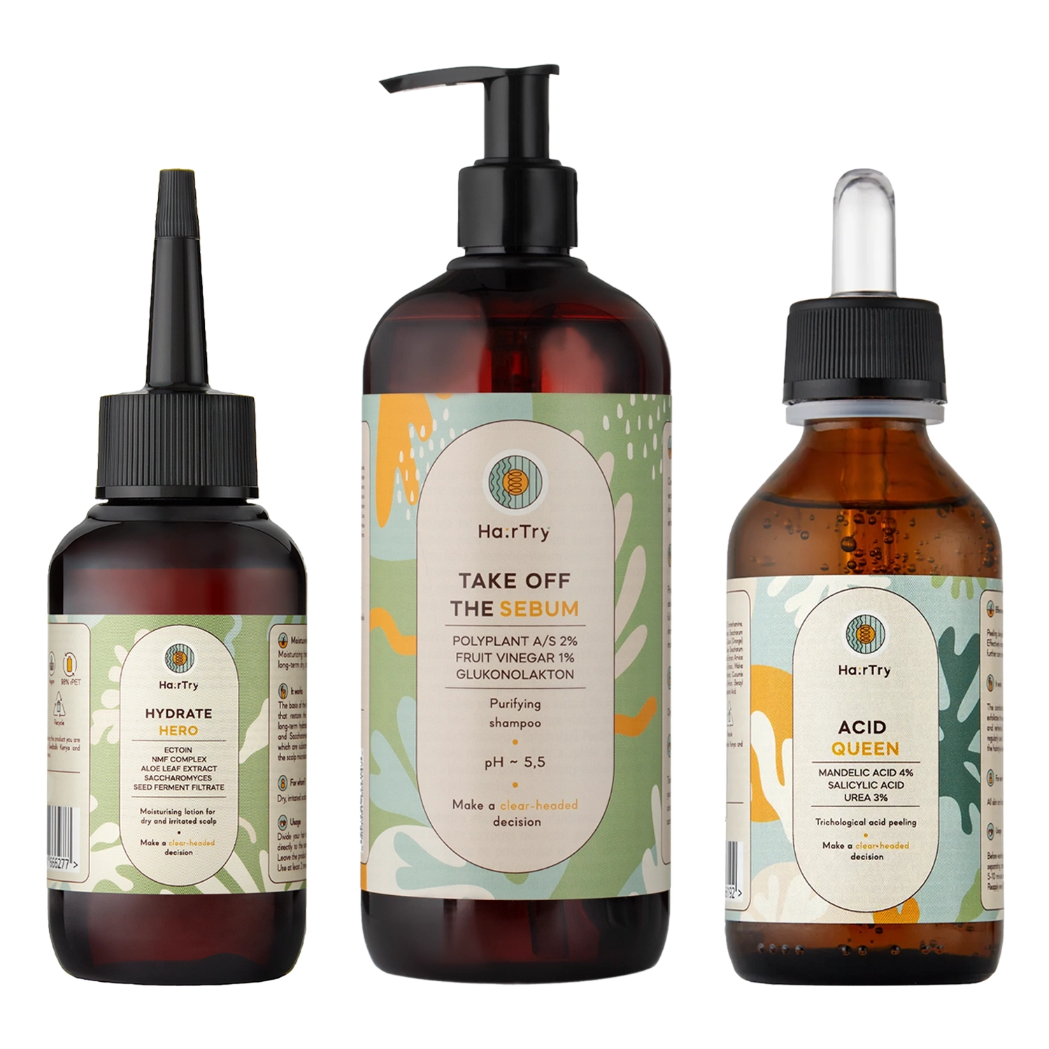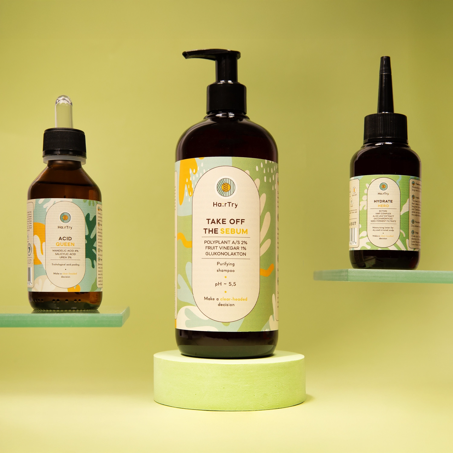 - Take Off The Sebum - šampon s čisticím a svěžest prodlužujícím účinkem. Složení je určeno pro pokožku hlavy se sklonem k mastnotě a krepaté, nedostatečně lesklé vlasy. Jeho gelové složení snadno vytváří příjemnou pěnu a díky své viskozitě při aplikaci neprosakuje přes prsty. Použité smíšené povrchově aktivní látky (aniontové, amfoterní a neiontové) zajišťují důkladné čištění, aniž by způsobovaly podráždění nebo vysušení. Kromě základních složek obsahuje šampon také pečující účinné látky, jako např: 2 % POLYPLANT A/S, 1 % ovocný ocet a glukonolakton. Při pravidelném používání se vlasy odrážejí od kořínků a dodávají jim objem, přičemž vlasy jsou po použití uvolněné a lehké. Svěží, lehce parfémovaná vůně zpříjemňuje aplikaci. Jeho objem je 500 ml.