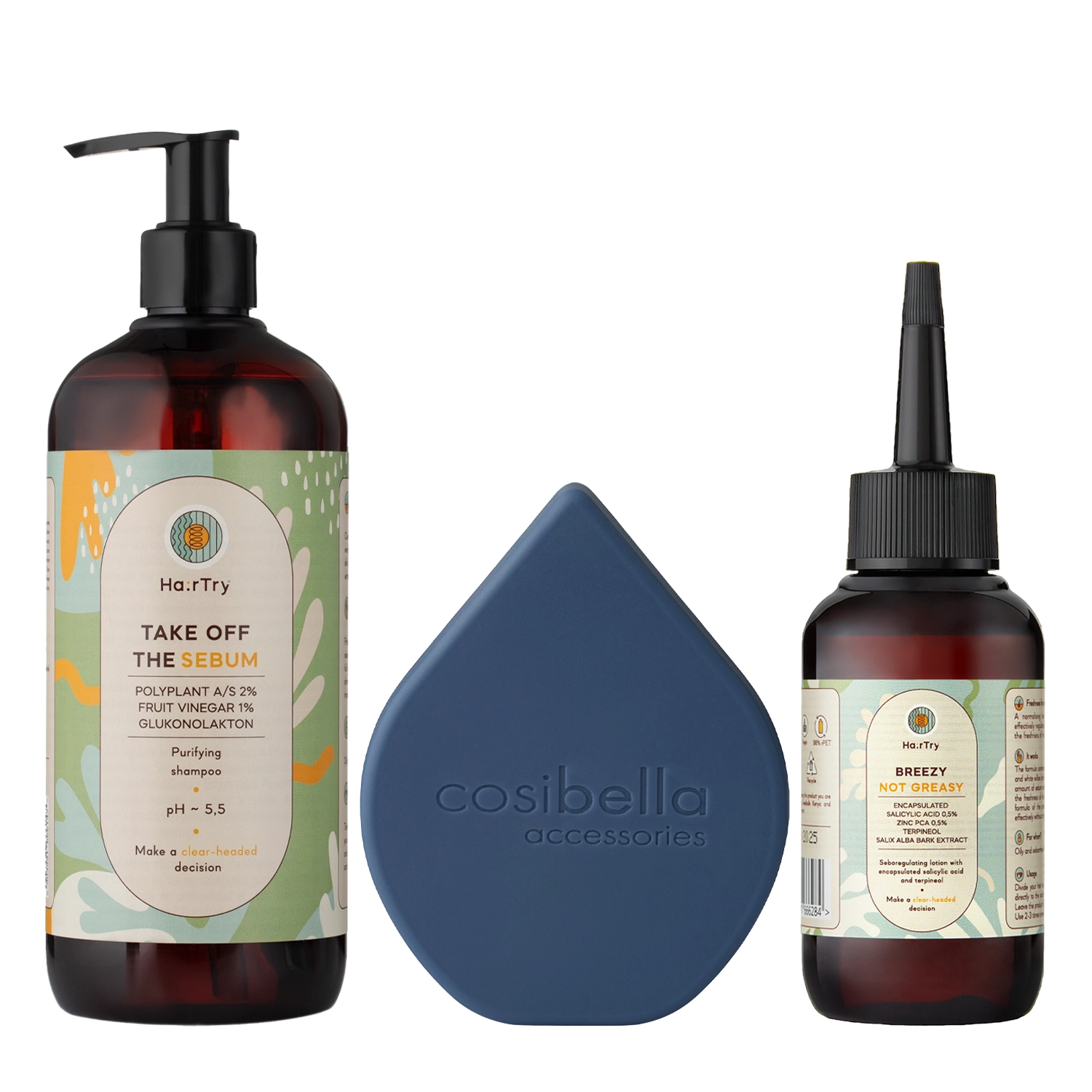 - Take Off The Sebum - šampon s čisticím a osvěžujícím účinkem. Složení je určeno pro pokožku hlavy se sklonem k mastnotě a krepaté, nedostatečně lesklé vlasy. Jeho gelové složení snadno vytváří příjemnou pěnu a díky své viskozitě při aplikaci neprotéká přes prsty. Použité smíšené povrchově aktivní látky (aniontové, amfoterní a neiontové) zajišťují důkladné čištění, aniž by způsobovaly podráždění nebo vysušení. Kromě základních složek obsahuje šampon také pečující účinné látky, jako např: 2 % POLYPLANT A/S, 1 % ovocný ocet a glukonolakton. Při pravidelném používání se vlasy odrážejí od kořínků a dodávají jim objem, přičemž vlasy jsou po použití uvolněné a lehké. Svěží, lehce parfémovaná vůně zpříjemňuje aplikaci. Jeho objem je 500 ml.