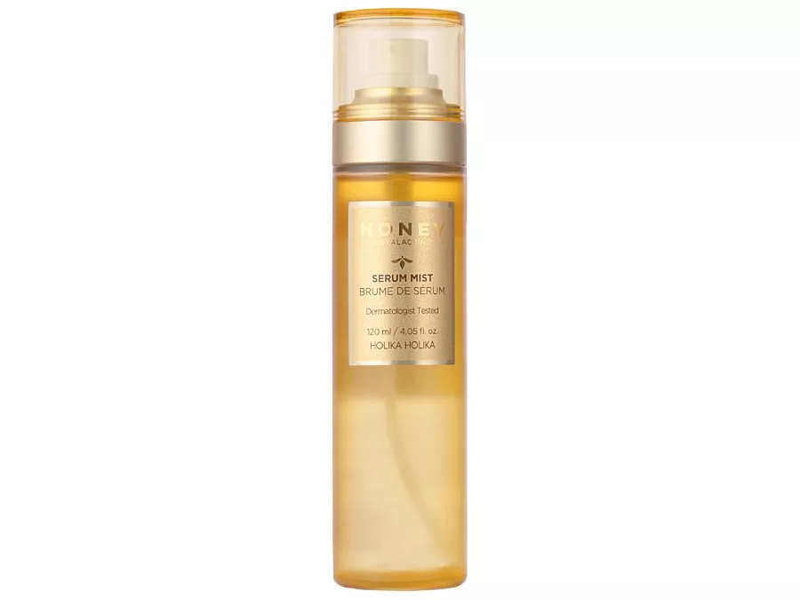 Holika Holika - Honey Royalactin Serum Mist - dvoufázová pleťová mlha pro všechny typy pleti. Obsahuje niacinamid, který reguluje práci mazových žláz, má antioxidační, protizánětlivé a rozjasňující vlastnosti a med má hydratační a regenerační účinky. Extrakt z kurkumy má antibakteriální a protizánětlivé vlastnosti a bojuje proti volným radikálům, adenosin zpevňuje a zlepšuje elasticitu pleti a extrakt z listů neem (tropický strom nimba) zklidňuje podráždění a má antibakteriální vlastnosti. Pleťová mlha doplňuje lipidy, chrání pokožku před suchem, napíná a vyhlazuje, zlepšuje regeneraci a snižuje podráždění.