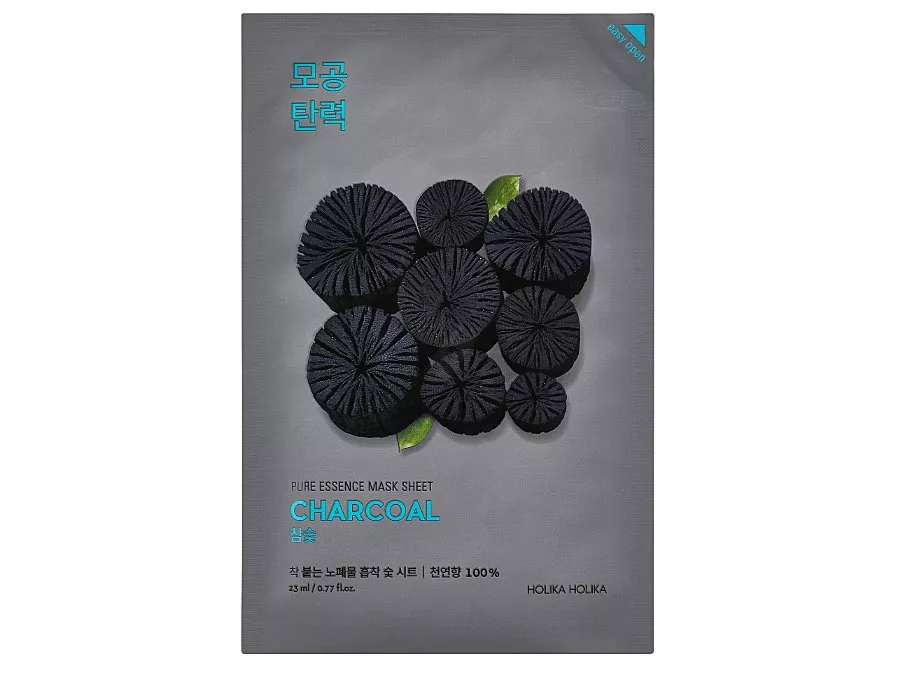 Holika Holika - Pure Essence Mask Sheet - Charcoal - plátýnková maska s obsahem aktivního uhlí, které má antibakteriální účinky, jemně stahuje a absorbuje přebytečný kožní maz. Extrakt z pupečníku asijského působí protizánětlivě, zmírňuje podráždění a urychluje regenerační procesy a panthenol zklidňuje a regeneruje. Do přípravku přidaný hyaluronát sodný zlepšuje úroveň hydratace pokožky a extrakt z heřmánku zklidňuje a působí antioxidačně.