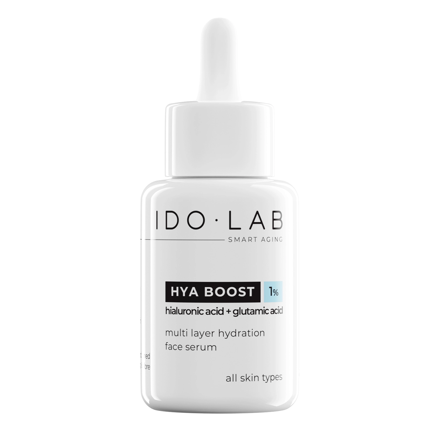 Ido Lab - Hya Boost - pleťové sérum s hydratačním účinkem. Obsahuje složky, jako je kyselina hyaluronová, kyselina glutamová a aminokyseliny, které společně zadržují vodu v epidermis, zajišťují hloubkovou hydrataci a vyhlazují pleť. Navíc posilují ochrannou bariéru pleti, snižují její reaktivitu na vnější faktory a minimalizují výskyt zarudnutí a podráždění. Po pravidelném používání získává pleť zdravý, zářivý vzhled a stává se pružnější a hydratovanější.