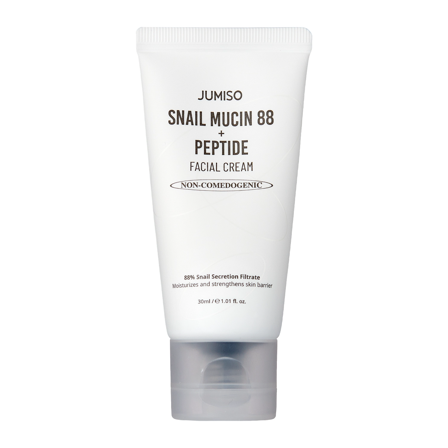 Jumiso - Snail Mucin 88 + Peptide Cream - krém-gel s lehkou texturou určený pro všechny typy pleti, zejména pro problematickou, mastnou pleť a pleť s pigmentovými skvrnami. Obsahuje filtrát hlemýždího slizu a niacinamid s intenzivním regeneračním účinkem, snižuje sekreci kožního mazu a vyrovnává zabarvení. Přídavek alantoinu a betainu zaručuje hydratační a protizánětlivý účinek, zatímco peptidový komplex silně regeneruje podrážděnou pleť. Kosmetický přípravek zanechává pleť hydratovanou a zklidněnou, podporuje redukci pigmentových skvrn a redukuje skvrny.