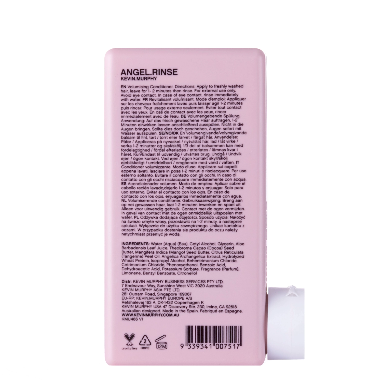 Kevin Murphy - Angel Rinse - kondicionér dodává objem a posiluje vlasy zničené barvením a stylingem. Obsahuje mangové máslo, které zlepšuje pružnost vlasů, kakaové máslo, které chrání před ztrátou vlhkosti a před účinky vnějších vlivů, šťávu z aloe vera, která hydratuje vlasy a zklidňuje podrážděnou pokožku hlavy a hydrolyzát pšeničného proteinu, který regeneruje a minimalizuje elektrizování vlasů. Kondicionér dodává vlasům objem a zanechává je měkké.