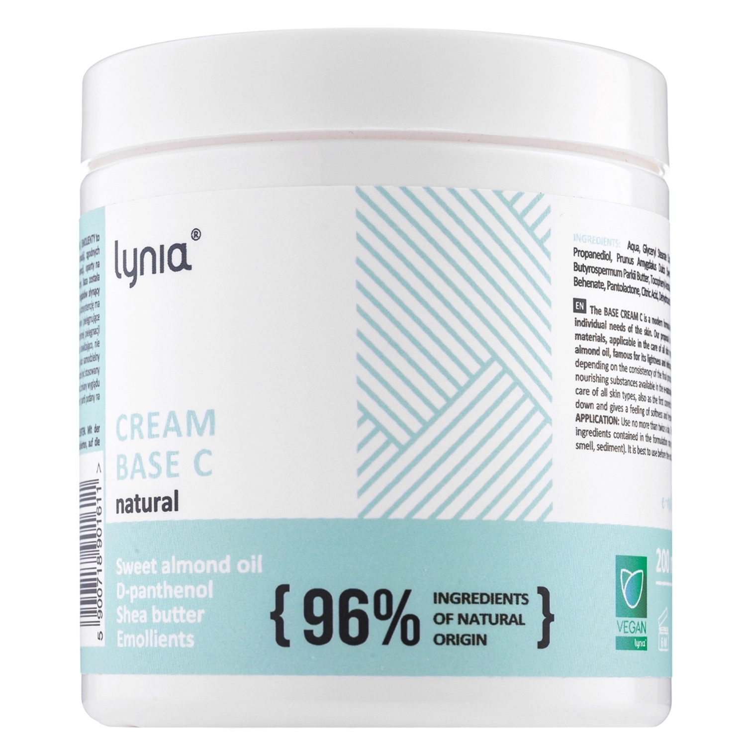 Lynia - Cream Base C Natural - Lehký hydratační krém/báze s vitamíny B5 a E - lehký krém na bázi přírodních složek, vhodný pro všechny typy pleti. Přípravek obsahuje panthenol a vitamín E a byl dále obohacen o olej ze sladkých mandlí, který je znám pro své jemné a lehké složení. Krém/báze hydratuje, nezatěžuje pleť a zanechává ji svěží a hebkou na dotek. Lze používat i samostatně.