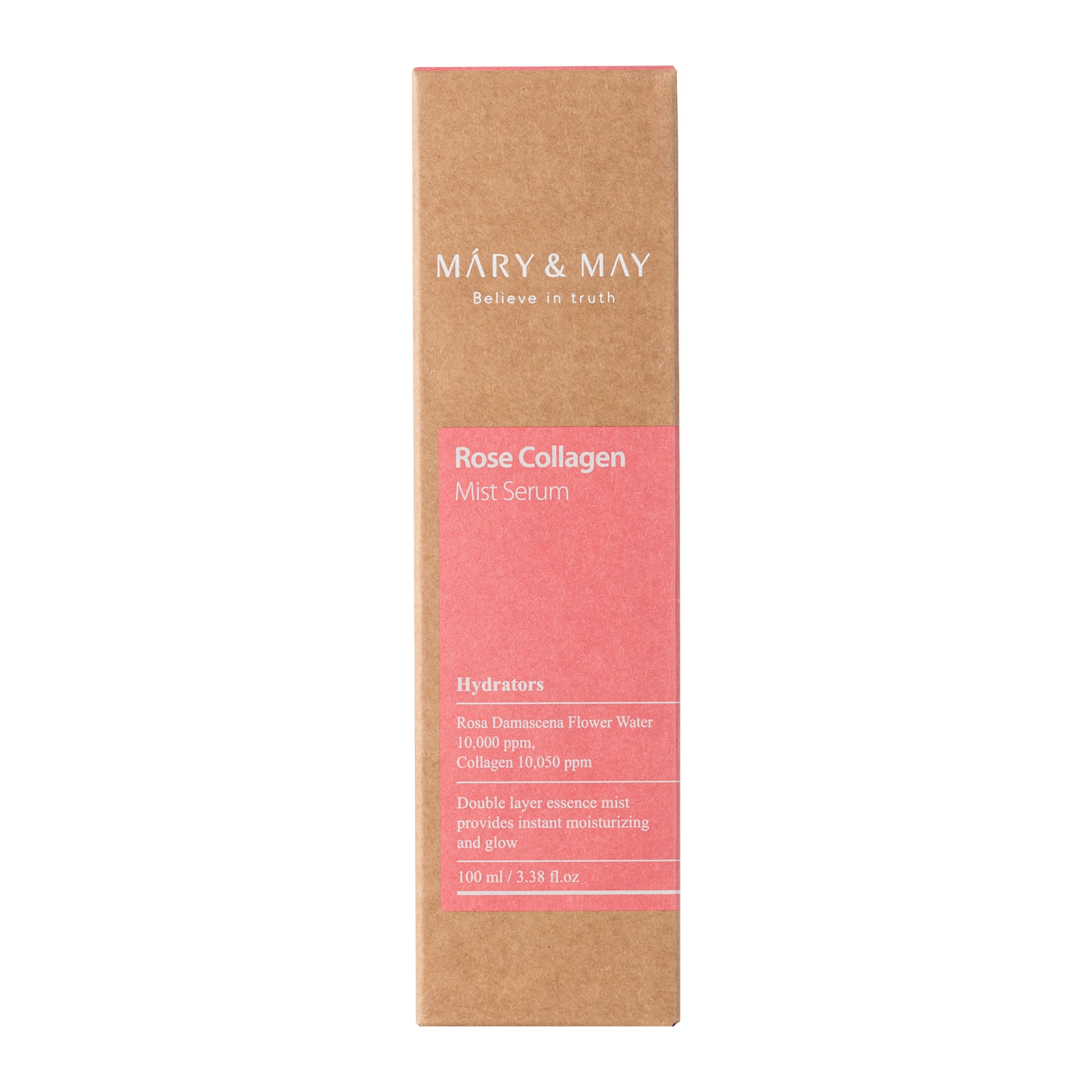 Mary&May - Rose Collagen Mist Serum - dvoufázové sérum ve formě pleťové mlhy. Obsahuje vodnatou fázi s hydratačním účinkem, olejovou fázi s vyživujícím účinkem a pohodlný aplikátor. Přípravek na bázi hydrolátu z růže damašské, který zklidňuje a byl dále obohacen o kolagen, který vyhlazuje a zlepšuje elasticitu pleti, niacinamid, který zesvětluje pigmentové skvrny a reguluje sekreci kožního mazu a avokádový olej, který vyživuje, vyhlazuje a doplňuje chybějící lipidy. Veganský, hypoalergenní produkt.