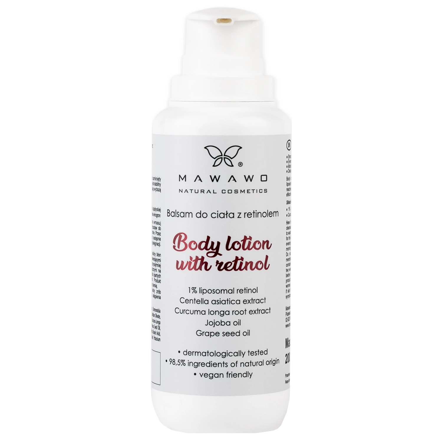 Mawawo - Body Lotion with Retinol - Tělový balzám s retinolem - pečující balzám pro na dotek drsnou pokožku, pokožku se sklonem k akné a pokožku s nejednotným tónem. Obsahuje 1 % retinolu uzavřeného v liposomech, které zajišťují jeho stabilitu a umožňují mu pronikat do hlubších vrstev pokožky; působí proti stárnutí, redukuje nedokonalosti, sjednocuje tón pleti, reguluje proces olupování pokožky a vyhlazuje. Přípravek byl obohacen o emolienty: olej z hroznových jader a jojobový olej, které vyživují; extrakt z pupečníku asijského, který zklidňuje a regeneruje a vitamín E, který má antioxidační vlastnosti. Produkt není vhodný pro těhotné a kojící ženy. Veganský produkt na bázi 98,5 % složek přírodního původu.