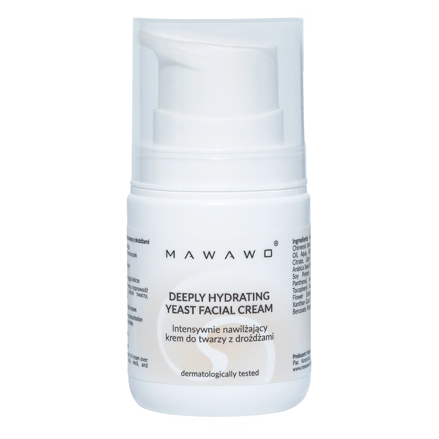 Mawawo - Hloubkově hydratační kvasnicový krém na obličej - krém s lehkým složením pro každodenní péči o obličej. Hydrolyzovaný extrakt z kvasnic obsažený ve složení kosmetického přípravku zlepší stav a úroveň hydratace pokožky. Výtažek z kávových semínek Arabica, obsahující polyfenoly a kofein, bude působit proti škodlivým účinkům volných radikálů a zmírní výskyt tmavých kruhů pod očima. Přídavek hydrolyzovaného sójového proteinu zvýší pružnost pokožky a podpoří procesy zadržování vody v rohové vrstvě. Kyselina hyaluronová mezitím zklidní záněty a podráždění, zatímco extrakt z listů aloe vera zlepší úroveň hydratace pleti a sníží její zarudnutí.