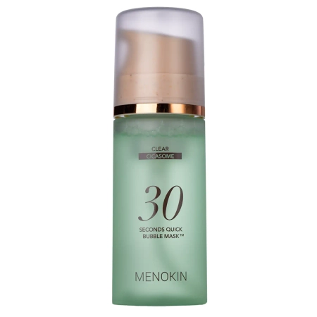 MENOKIN - 30 Seconds Quick Bubble Mask Clear - zklidňující pěnová maska na obličej, která jemně zahalí pleť a zanechá ji svěží, hladkou a plnou komfortu. Složení s antioxidantem niacinamidem neutralizuje škodlivé účinky volných radikálů a zároveň reguluje tvorbu kožního mazu a redukuje vzhled ústí mazových žláz, čímž obnovuje matnou a hladkou pleť. Adenosin, známý svými proti vráskámch a protivráskovými vlastnostmi, zase pomáhá zlepšit pevnost a pružnost pleti. Přídavek vody z bavlníkových semen, výtažku z listů Centella Asiatica a kyseliny hyaluronové zklidňuje podráždění, regeneruje a intenzivně hydratuje pleť. Díky nim je jemnější, hedvábnější, zklidněná a zářivá. Maska je uzavřena v lahvičce s praktickým aplikátorem, který po stisknutí vytvoří nadýchanou sametovou pěnu pro výjimečný požitek z aplikace.