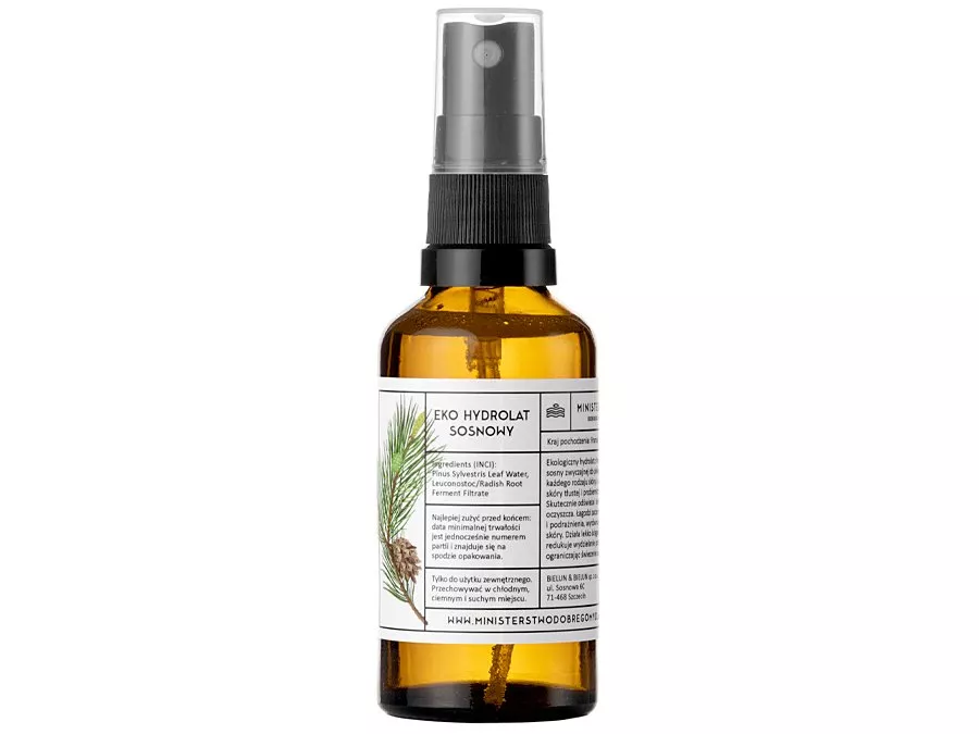 Ministerstwo Dobrego Mydła - Hydrolát EKO z borovice - ekologický hydrolát získaný z borovice lesní, který osvěžuje a zklidňuje podráždění a svědění – je proto vhodný i po holení. Navíc mírně stahuje, reguluje sekreci potu a kožního mazu a minimalizuje nadměrný lesk pleti během dne. Je vhodný zejména pro mastnou a smíšenou pleť. 100% přírodní produkt – vůně, barva a konzistence se může mírně lišit v závislosti na šarži. Přípravek má specifickou vůni.