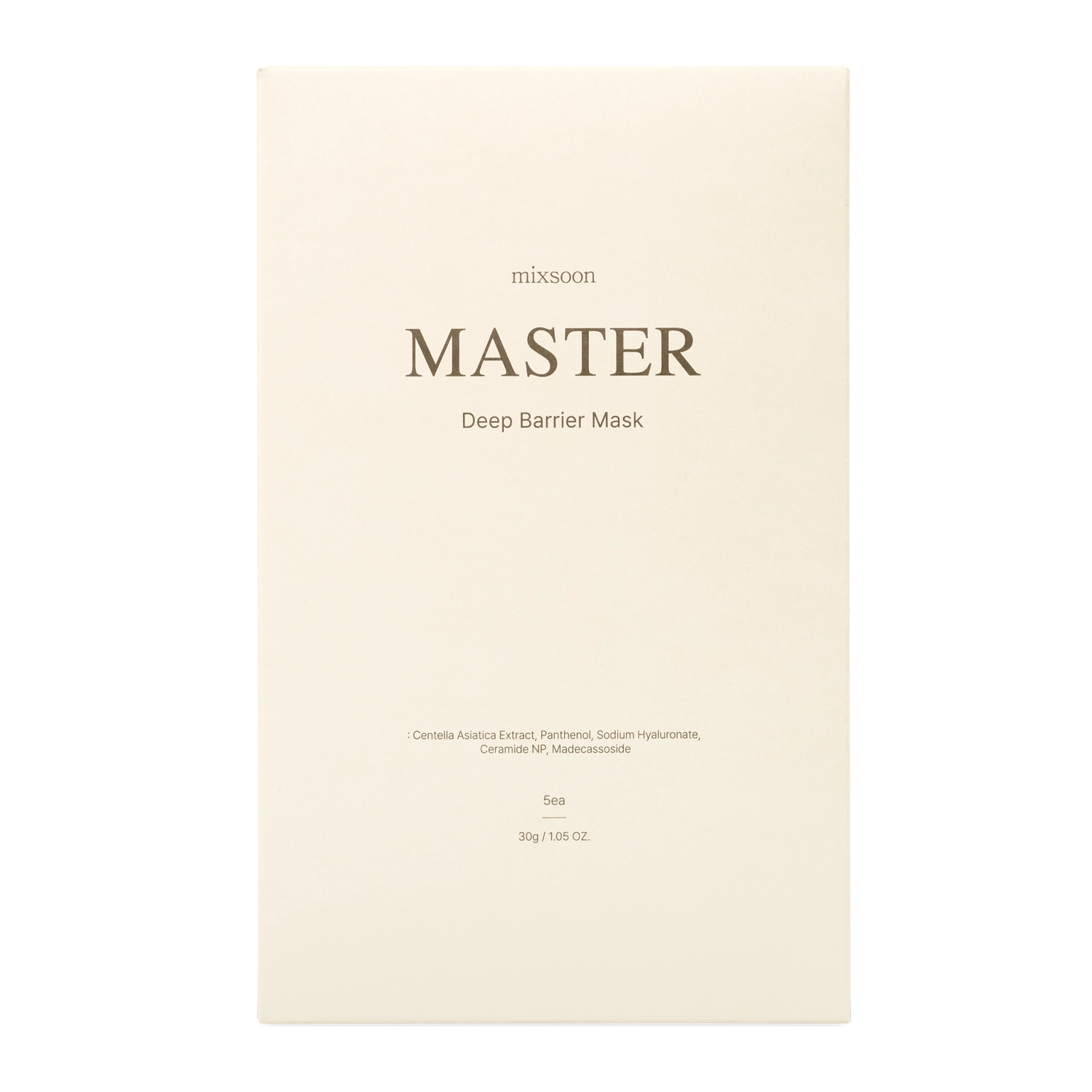 Mixsoon - Master Deep Barrier Mask - sada 5 textilních masek, které posilují hydrolipidovou bariéru. Masky jsou namočeny do esence bohaté na extrakt z pupečníku asijského, který intenzivně zklidňuje a regeneruje. Složení bylo dále obohaceno o ceramidy a kyselinu hyaluronovou, které vyživují vysušenou pokožku a zajišťují dostatečnou úroveň hydratace a panthenol a allantoin, které zklidňují podráždění a zarudnutí. Masky byly vyrobeny z příjemného materiálu, který dobře přilne k pokožce. Vhodné pro suchou pleť a pokožku s narušenou hydrolipidovou bariérou.