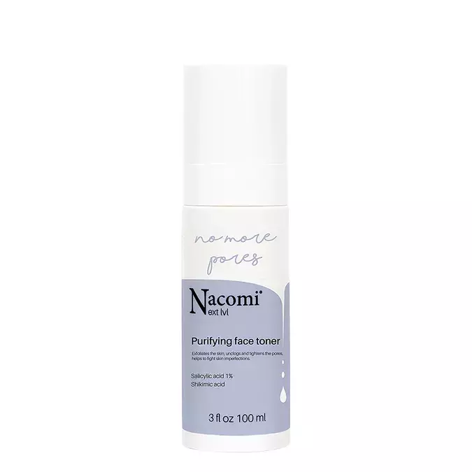Nacomi - Next Level - Purifying Face Toner - tonikum pro mastnou, smíšenou a aknózní pleť. Obsahuje kyselinu salicylovou, která exfoliuje a má sebo-regulační účinky, kyselinu šikimovou, která sjednocuje tón pleti a čistí ucpané póry a niacinamid, který zklidňuje zánětlivé projevy. Přípravek byl dále obohacen o extrakt z proskurníku lékařského, který regeneruje a extrakt ze zeleného čaje, který hydratuje. Tonikum zanechává pokožku čistou a hladkou na dotek.