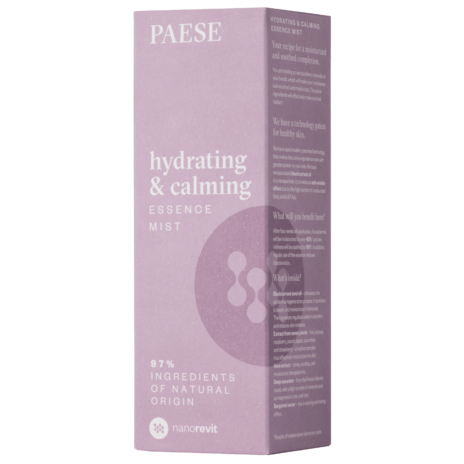 Paese - Nanorevit - Hydrating & Calming Essence Mist - esence na obličej a tělo. Obsahuje aloe vera, které hydratuje a zklidňuje podráždění, mořskou vodu, která zklidňuje zánětlivé projevy a má antiseptické účinky, olej z černého rybízu, který vyživuje a snižuje sekreci kožního mazu a extrakt z papáji, který pomáhá redukovat pigmentové skvrny a zanechává pokožku příjemně hladkou na dotek. Produkt na bázi 97 % složek přírodního původu.
