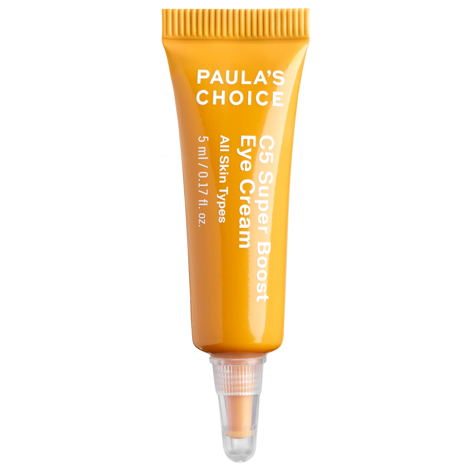 Paula's Choice - C5 Super Boost Eye Cream - lehký oční krém redukující tmavé kruhy a otoky pod očima. Obsahuje vitamín C ve 3 stabilních formách v celkové koncentraci 5 %, konkrétně 2 % 3-O Ethyl Ascorbic Acid, 2 % Ascorbyl Glucoside a 1 % Ascorbyl Palmitate. Přípravek byl dále obohacen o peptidy, které snižují viditelnost vrásek, zpevňují a zlepšují pružnost pokožky, kyselinu hyaluronovou, která hydratuje, Zerumbone, složku získanou ze zázvoru, která redukuje kruhy pod očima a chrání před účinky volných radikálů a bambucké máslo, které chrání před vysoušením, zklidňuje a změkčuje.