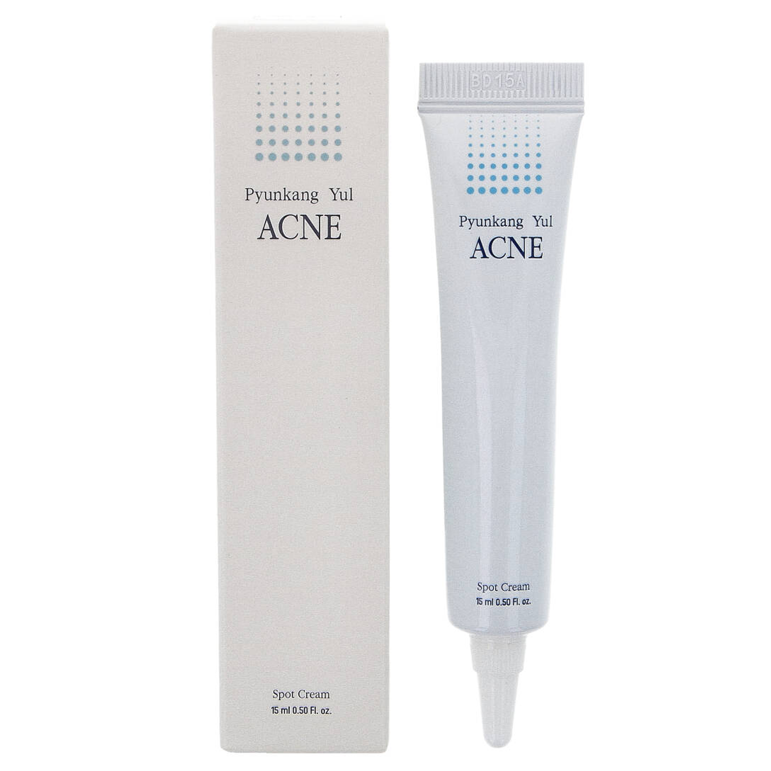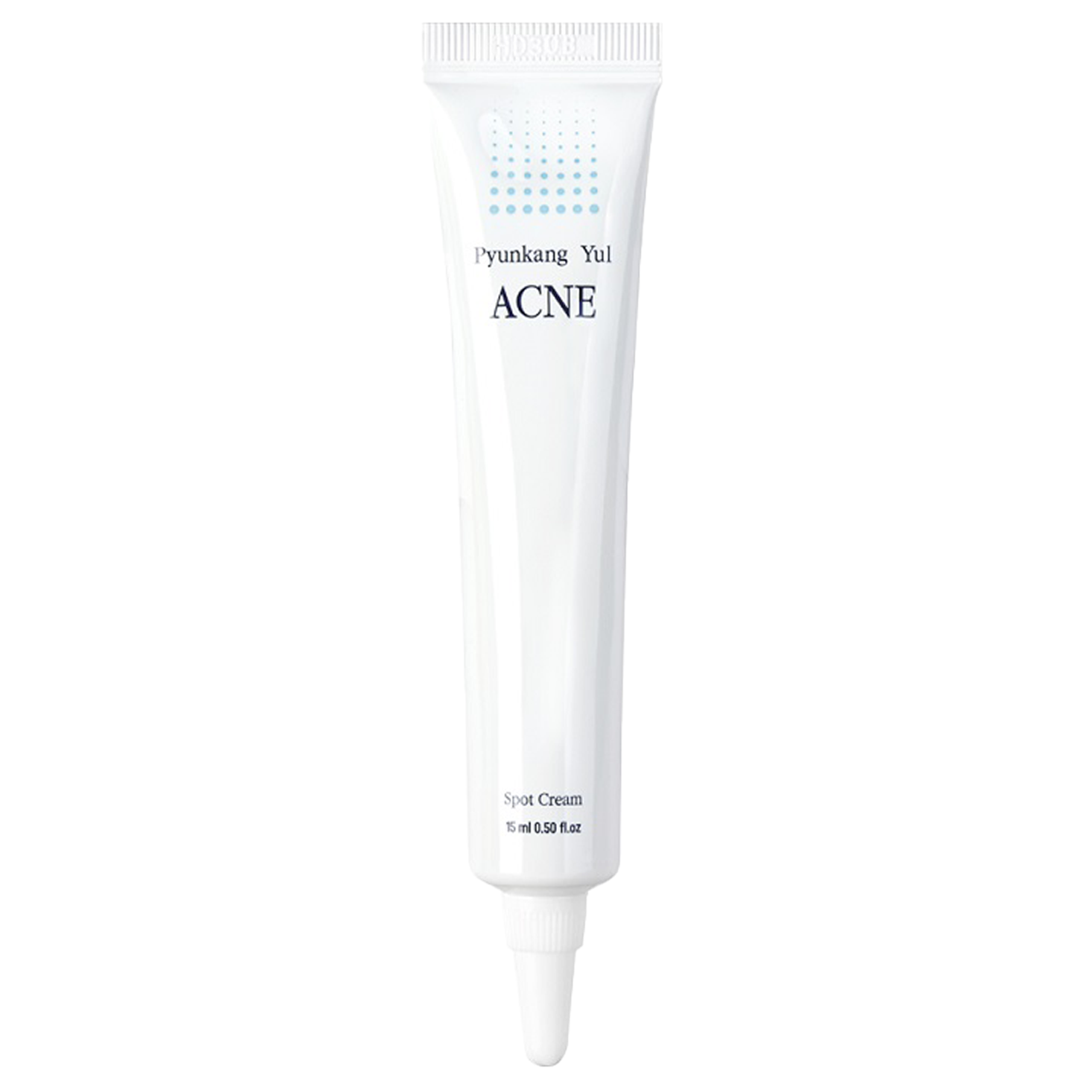 Pyunkang Yul - ACNE Spot Cream - lehký krém určený pro pleť se sklonem k akné. Obsahuje extrakt z bílé vrbové kůry, který má protizánětlivé a antibakteriální vlastnosti a extrakt z pupečníku asijského s regeneračními vlastnostmi. Krém byl obohacen o extrakt ze zeleného čaje, který osvěžuje a extrakt z kořene šišáku bajkalského, který urychluje regeneraci pokožky. V přípravku obsažený niacinamid a extrakt z křídlatky japonské zklidňují záněty a podporují jejich hojení. Krém má lehkou strukturu, lze jej použít ráno i večer.