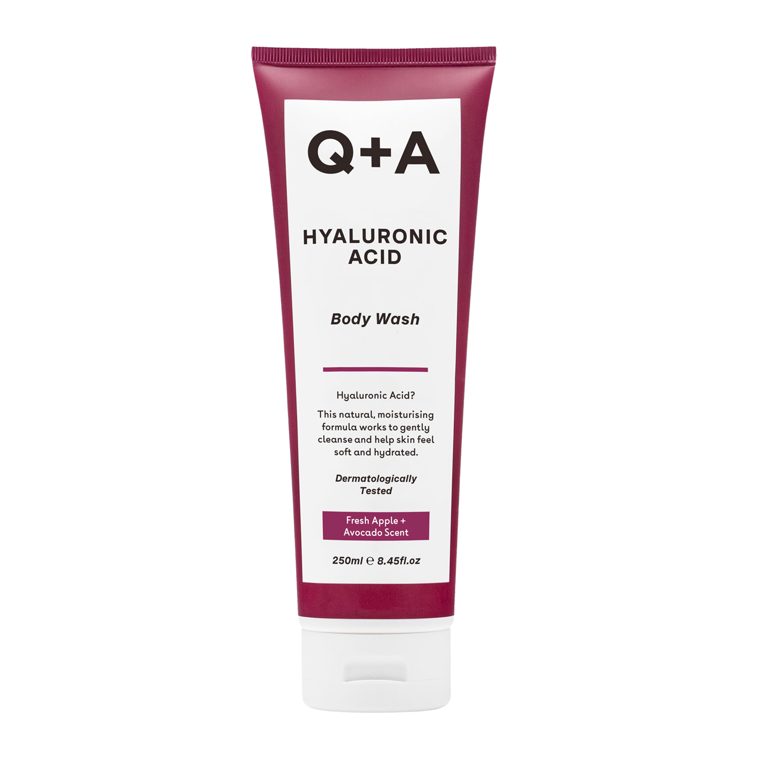 Q+A - Hyaluronic Acid Body Wash - sprchový gel se svěží vůní jablka a avokáda. Na bázi důkladně mycích látkách a byl obohacen o kyselinu hyaluronovou, která účinně hydratuje, vyhlazuje a zpevňuje, extrakt z aloe vera, který zpomaluje proces stárnutí, zklidňuje podráždění a regeneruje, Pentavitin, který dlouhodobě hydratuje a zabraňuje podráždění a extrakt z květů zimolezu, který má protizánětlivé a antibakteriální účinky.