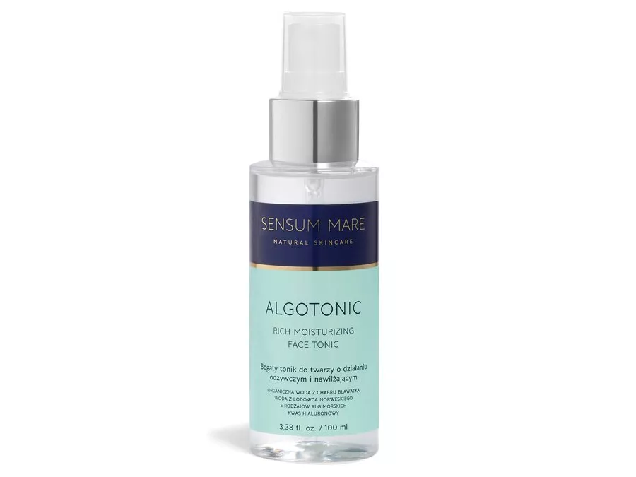 Sensum Mare - Algotonic - Rich Moisturizing Face Tonic - bohaté tonikum s jedinečnou kombinací vody z norského ledovce a 5 druhů mořských řas, které vyživují pokožku tím, že jí dodávají vitamíny, minerály a stopové prvky. Nízkomolekulární kyselina hyaluronová váže vodu v povrchových vrstvách pokožky, hloubkově hydratuje a zabraňuje vysoušení a organická voda z chrpy polní tonizuje, má protizánětlivé účinky a zklidňuje.
