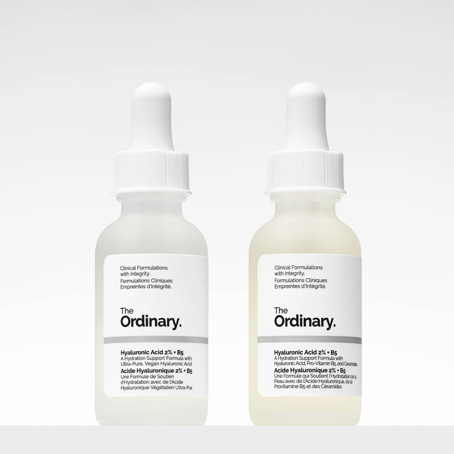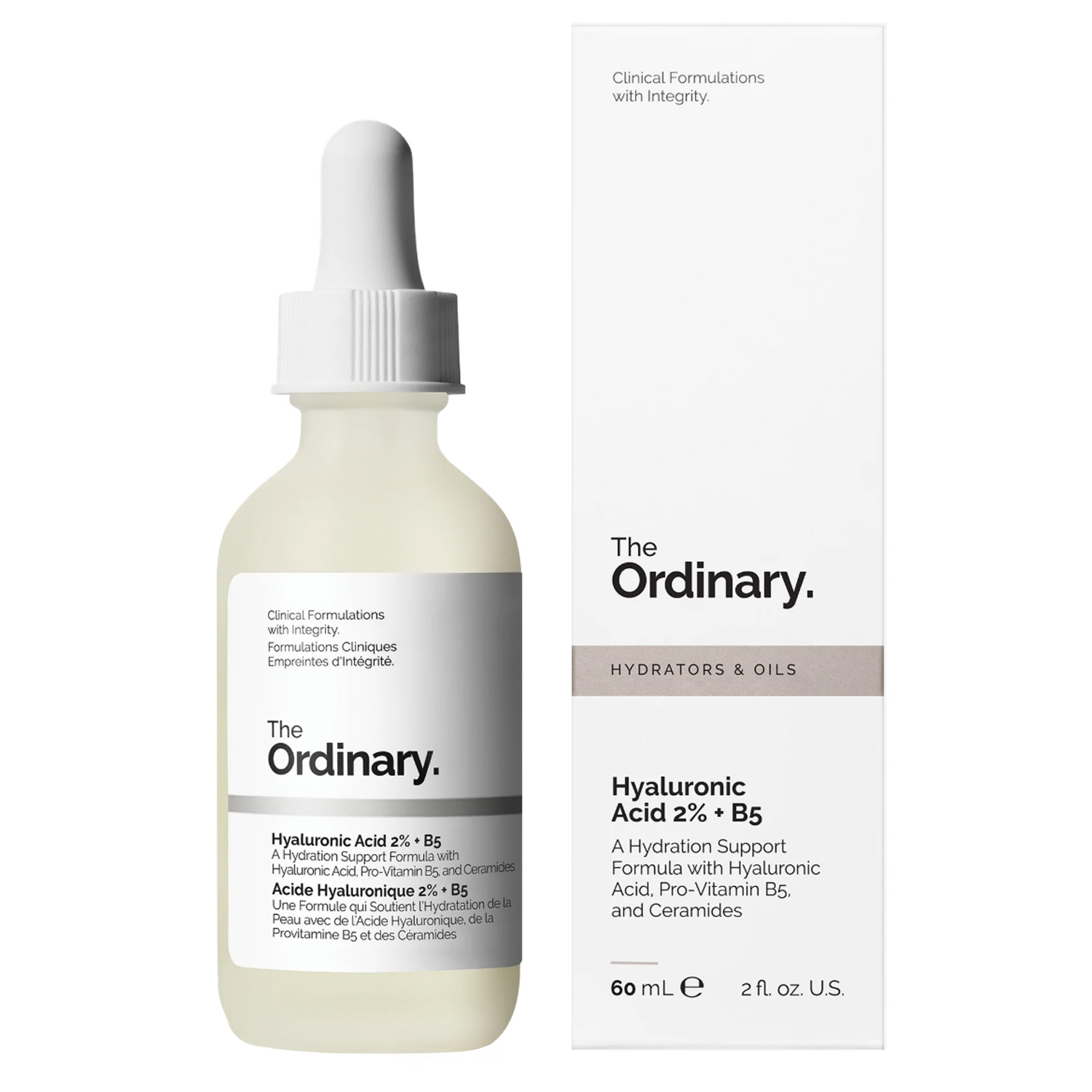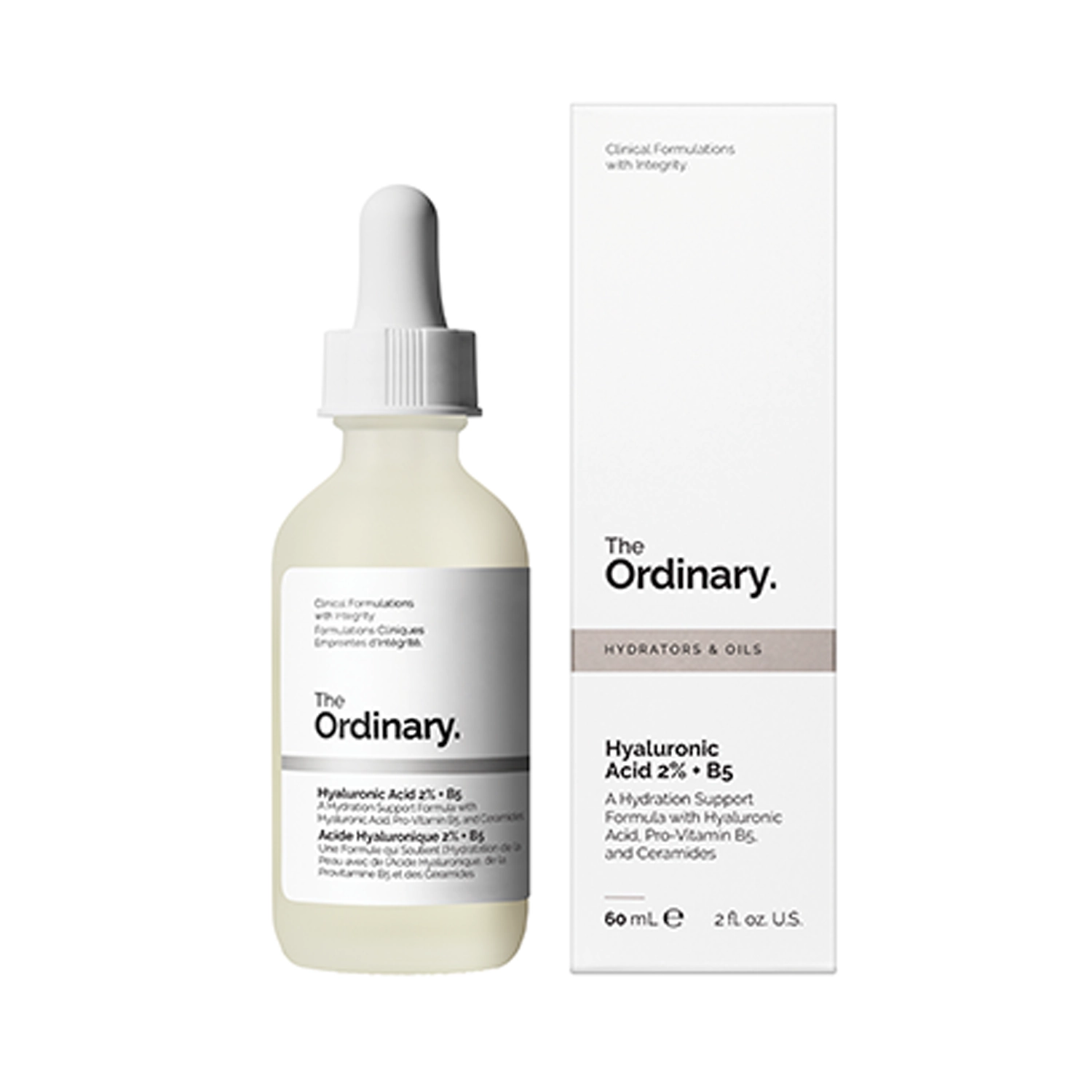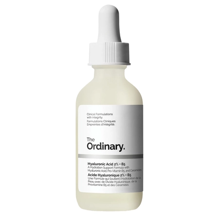 The Ordinary - Hyaluronic Acid 2% + B5 - přípravek na vodní bázi s vylepšeným složením kombinujícím nízko, středně a vysokomolekulární molekuly kyseliny hyaluronové a pokročilý zesíťovaný polymer kyseliny hyaluronové. Vyvinuto pro zvýšení hydratace pokožky. Působí proti vzniku vrásek a nedokonalostem struktury pleti. Provitamin B5 ve složení dále zlepšuje hydrataci, vyhlazuje a zvyšuje pevnost pleti. Výtažek z řasy Ahnfeltia Concinna zase podporuje regeneraci epidermis a zvyšuje její pružnost a vitamín E jako silný a účinný antioxidant brzdí procesy stárnutí pleti. Sérum se velmi rychle vstřebává a nezanechává na povrchu pleti lepivý film. Kosmetický produkt má pH 6,50-7,50. Nové složení má ve srovnání s předchozím mírně žlutý odstín díky přidání směsi ceramidů.