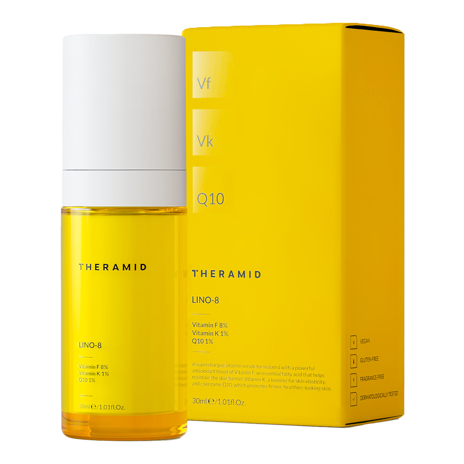 Theramid - LINO-8 - vitaminová péče na obličej s antioxidačním účinkem. Je ve formě emulzního séra, které se dobře vstřebává. Přípravek zlepšuje pevnost pleti, hydratuje ji a dodává jí zdravý lesk. Díky koenzymu Q10 poskytuje silný antioxidační, chrání před známkami předčasného stárnutí a redukuje výskyt vrásek. Vitamin F jako mastná kyselina posiluje kožní bariéru, zatímco vitamin K zlepšuje pružnost a tonus pleti. Přídavek skvalanu vyhlazuje a dlouhodobě hydratuje. Složení séra je veganské a bez parfemace. Přípravek se doporučuje pro zralou pleť, které chybí pevnost, se známkami stárnutí.