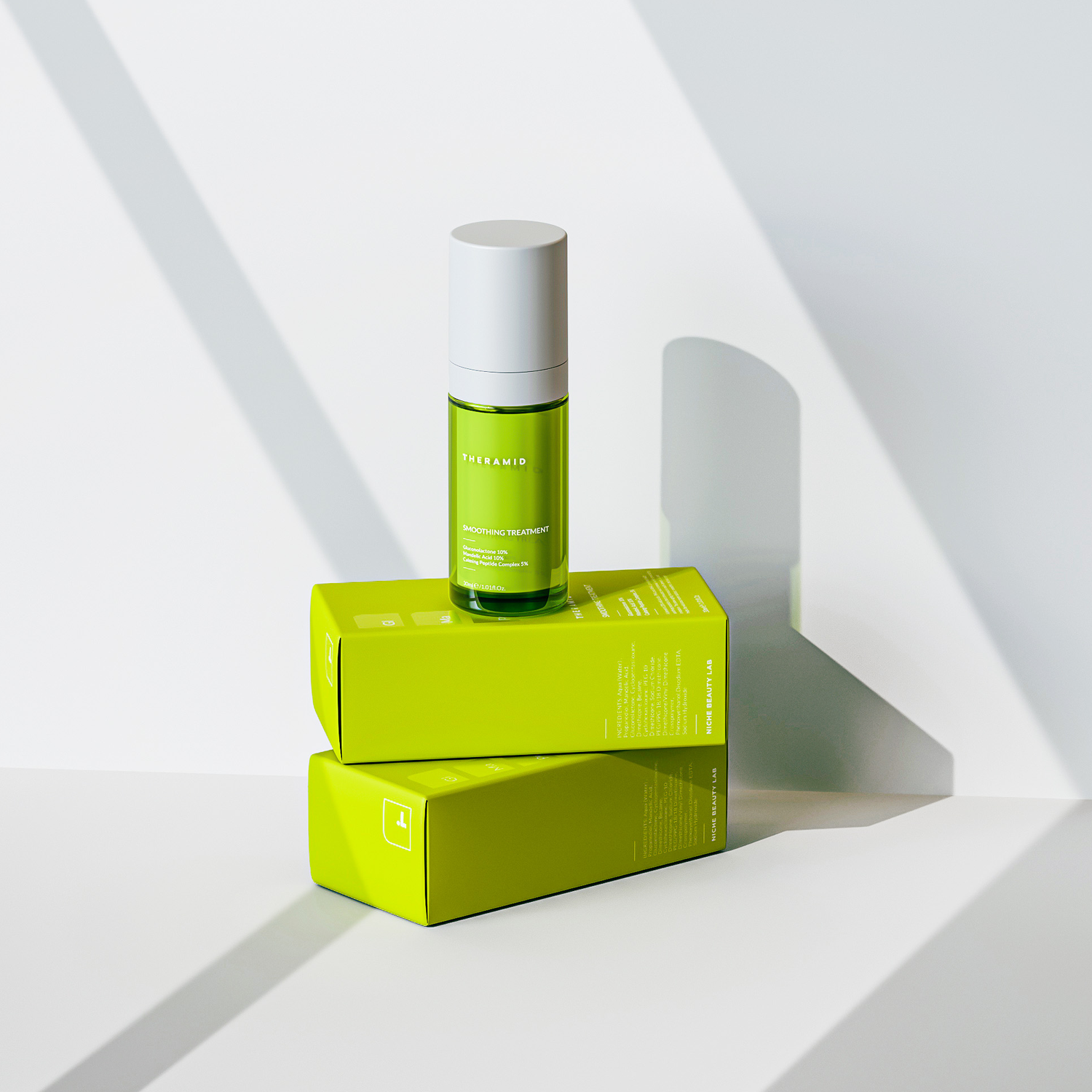 Theramid - Smoothing Treatment - kúra na obličej proti vráskám. Obsahuje účinnou směs AHA a PHA kyselin, tj. 10 % kyseliny mandlové a 10 % glukonolaktonu, které jemně exfoliují pokožka, čímž iniciují obnovu buněk. Tento proces zajišťuje zvýšenou hladkost, pevnost pleti a také rozjasnění barevných změn a krásný jas. V kombinaci se zklidňujícím a proti vráskámm peptidovým komplexem je navíc pleť vyživená a bez podráždění. Navzdory nízkému pH složení zůstávají peptidy stabilní a poskytují výhody exfoliace i peptidového působení, aniž by byla narušena účinnost kterékoli ze složek.