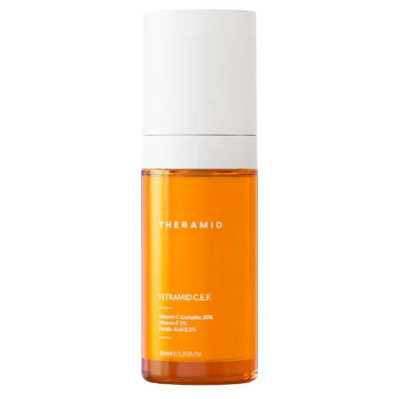 TETRAMID C.E.F. - intenzivní kúra s vitaminem C se silným antioxidačním účinkem. Přípravek má konzistenci řídké emulze. Zanechává na pleti rozjasňující účinek, bez mastného filmu. Obsahuje 3 formy vitaminu C o celkové koncentraci 20 %. Složení obsahuje askorbyl tetraisopalmitát s koncentrací 10 %, který je antioxidantem, má rozjasňující účinek, vyrovnává tón pleti a stimuluje tvorbu kolagenu. Vitamin C obnovuje zářivost pleti, zpomaluje stárnutí a bojuje proti volným radikálům. Je doplněn kyselinou ferulovou, která má rovněž antioxidační účinek a posiluje působení vitaminů C a E. Vitamin E chrání před volnými radikály a předčasným stárnutím a dodává pleti elasticitu. Má silný antioxidační účinek a intenzivně chrání pokožku. Kosmetický přípravek má veganské složení.