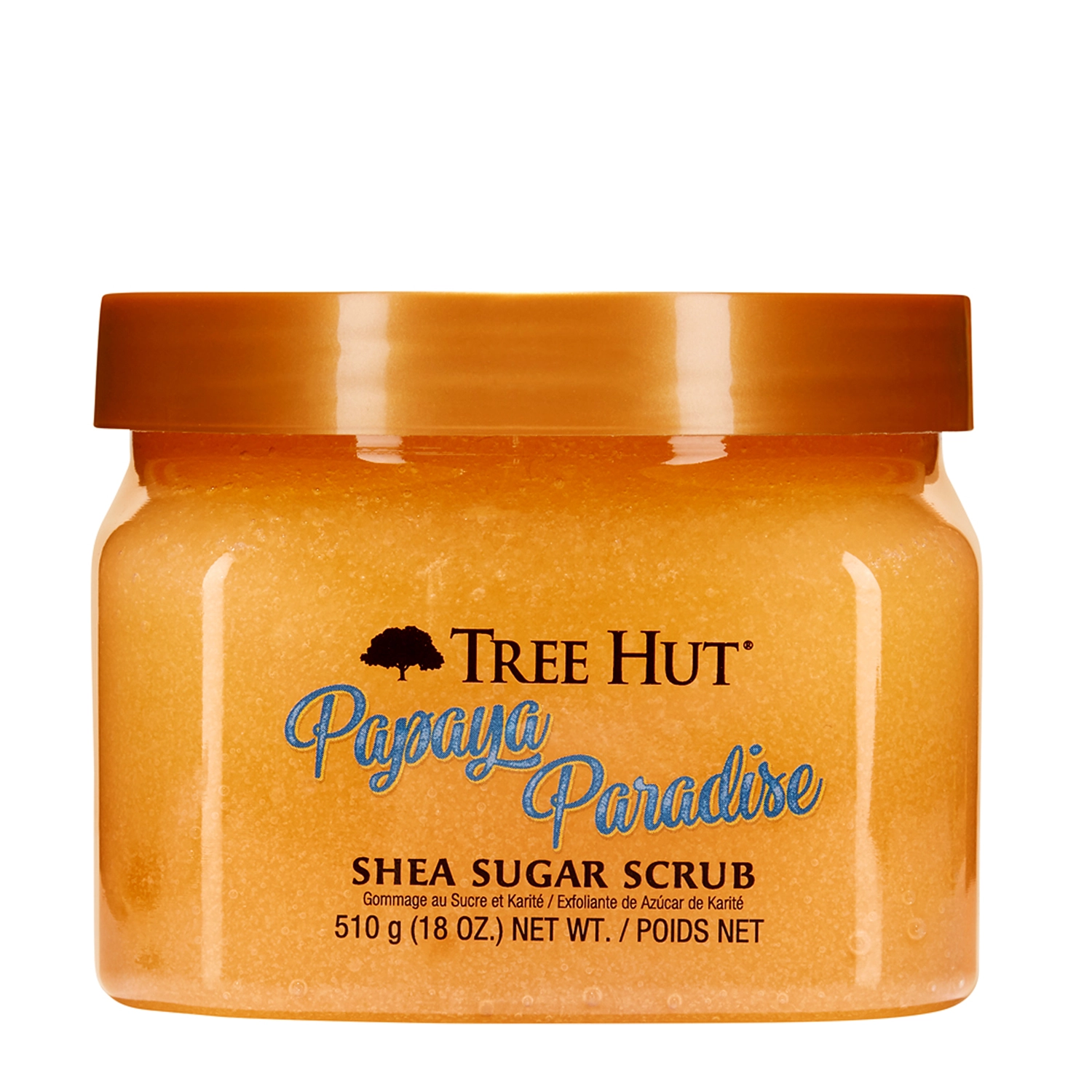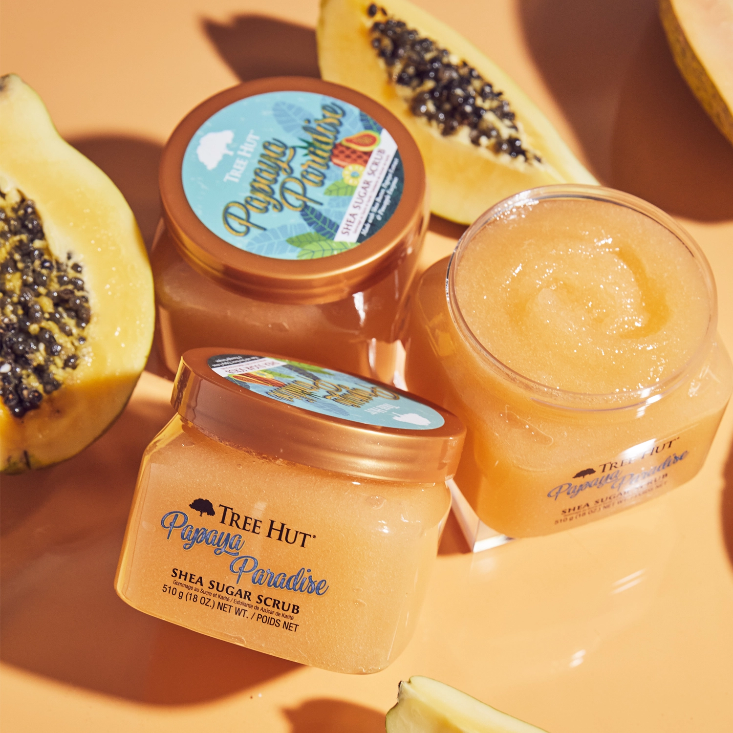 Tree Hut - Shea Sugar Scrub Papaya Paradise - Papaya - tělový peeling s vůní tropického ovoce. Hloubkově vyživuje a vyrovnává hydrataci pokožky a navrací jí krásný lesk. Obsažené částečky cukru, enzym papain a ananasové enzymy odstraňují odumřelou pokožku a odhalují zářivou, jemnou a hladkou pokožku. Složení v sobě skrývá bohatství rostlinných olejů a bambuckého másla, které společně udržují pleť v dobré kondici s intenzivní péčí. Přípravek je vhodný pro vegany.