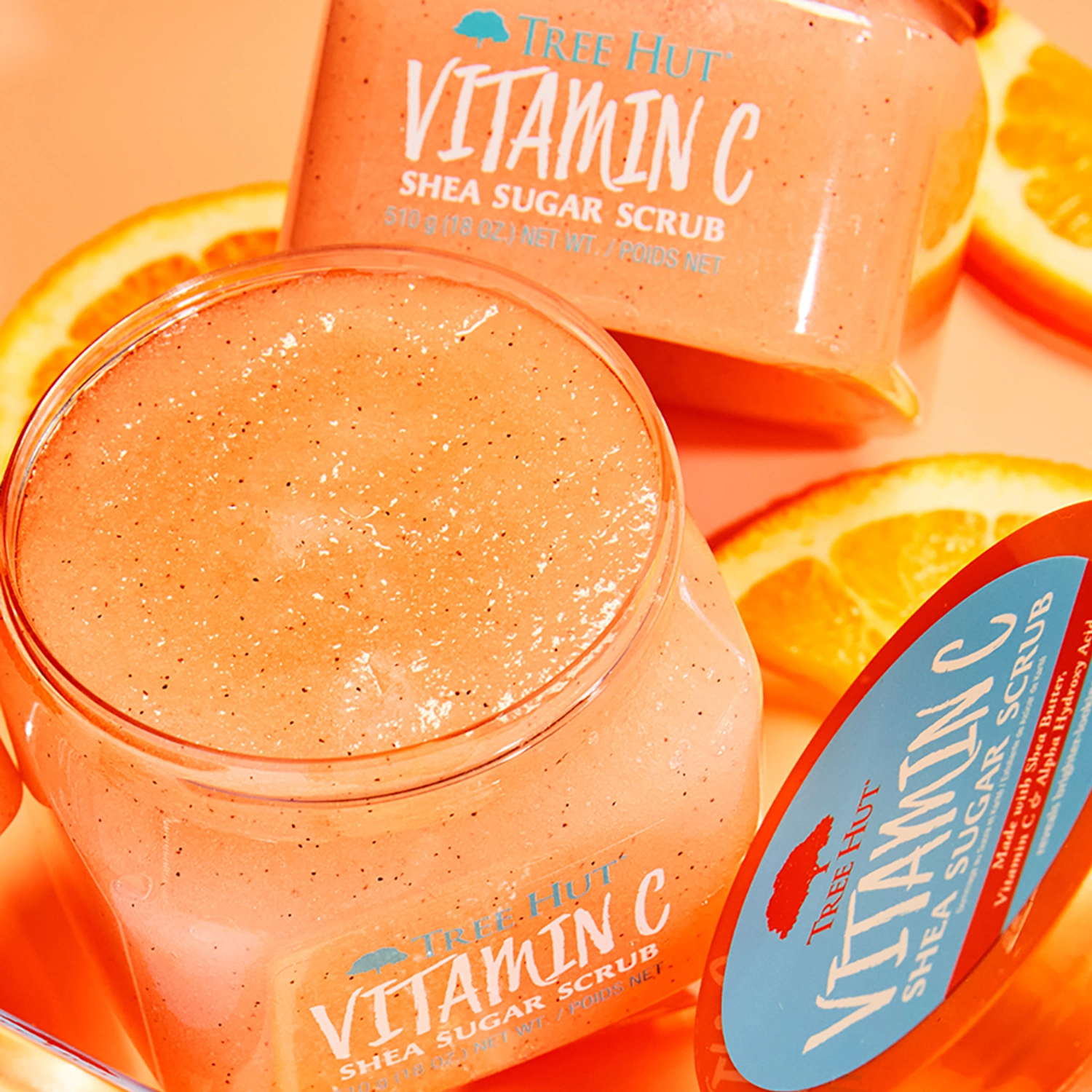 Tree Hut - Shea Sugar Scrub Vitamin C - Vitamin C - tělový peeling s citrusovou a květinovou vůní. Hloubkově vyživuje a vyrovnává hydrataci pokožky a navrací jí krásný lesk. Obsažené částečky cukru odstraňují odumřelou kůži a odhalují jemnou a hladkou pokožku, zatímco přítomný vitamin C dodává rovnoměrný a zářivý vzhled. Složení v sobě ukrývá také bohatství rostlinných olejů, bambucké máslo a kyselinu mléčnou, které se společně starají o dobrou kondici pleti s intenzivní péčí. Výrobek je vhodný pro vegany.