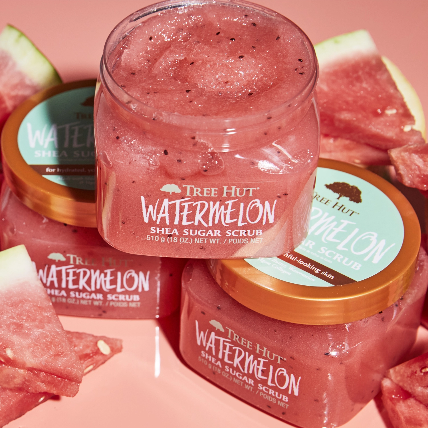 Tree Hut - Shea Sugar Scrub Watermelon - Vodní meloun - tělový peeling s vůní vodního melounu a malinové cukrové vaty. Hloubkově vyživuje a vyrovnává hydrataci pokožky a navrací jí krásný lesk. Obsažené částečky cukru odstraňují odumřelou pokožku a odhalují zářivou, jemnou a hladkou pokožku. Složení v sobě ukrývá bohatství rostlinných olejů, výtažek z vodního melounu, veganský kolagen a bambucké máslo, které společně udržují pokožku v dobré kondici, dodávají jí vlhkost a pevnost. Výrobek je vhodný pro vegany.